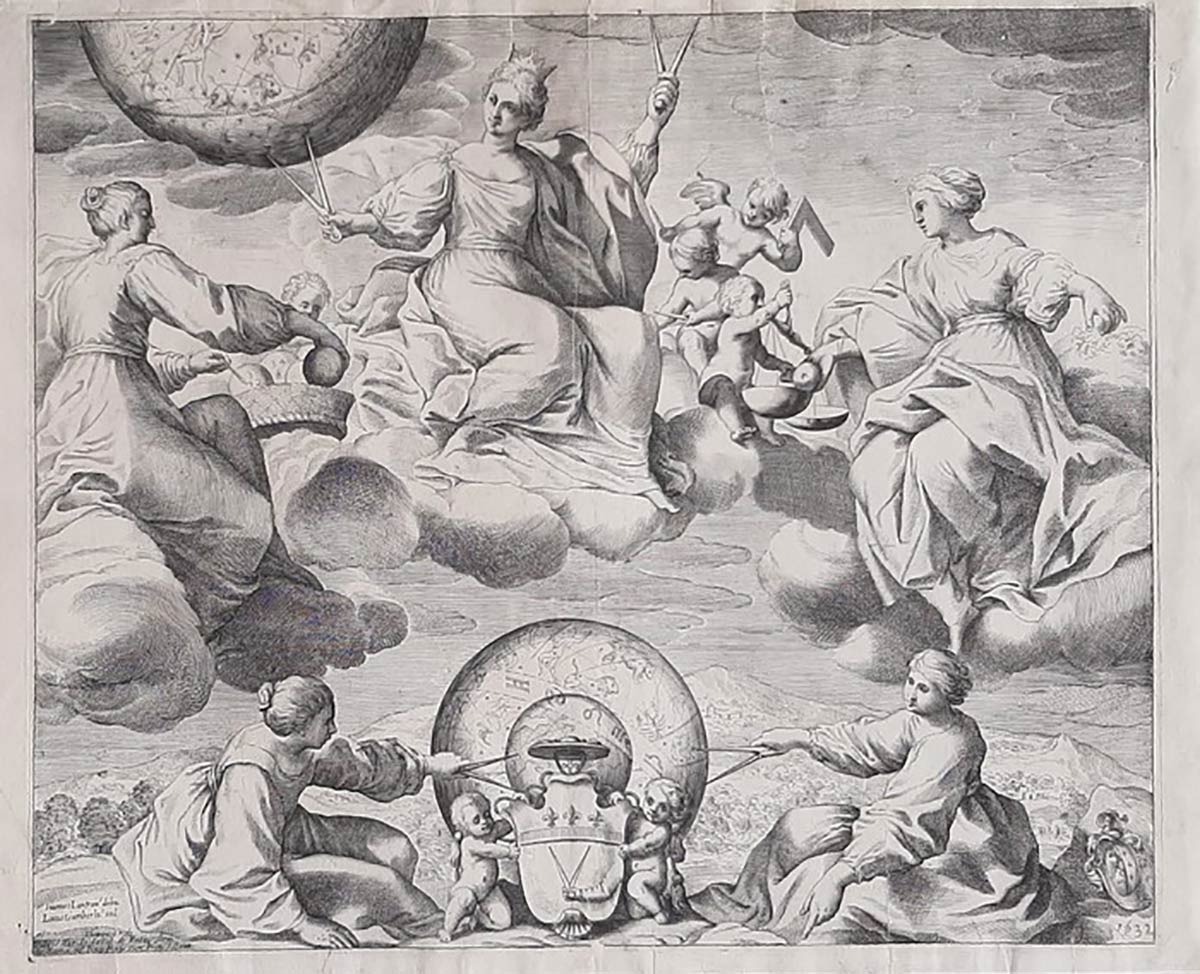 La personificazione dell’Astronomia al centro con due compassi, attorno varie figure femminili e dei putti con strumenti di misura, in alto a sinistra un globo con la volta del firmamento e i segni zodiacali. Entro inciso in basso a sinistra i nomi degli autori e l’editore.
