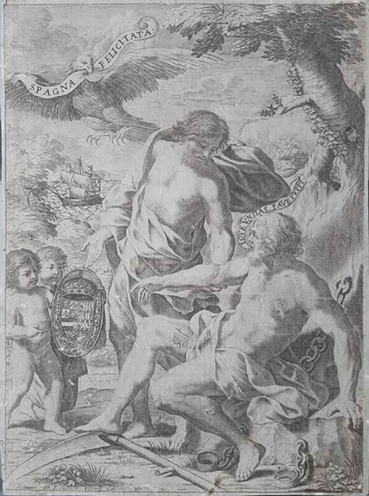 Allegoria della eterna forza della Spagna, un uomo in piedi, Cristo, solleva con la sinistra il Tempo sciolto dalle catene mentre con la destra indica lo stemma reale spagnolo, in alto una aquila tiene nel becco un cartiglio con l’iscrizione, mentre dalla bocca del Tempo esce un filatterio con la scritta “Fodes unda, fave puppi”. In basso a sinistra entro inciso “Fr Romanelli Viterb. del.”. Esemplare raro in discreto stato di conservazione con qualche piccol restauro e una evidente riga all’altezza del petto del santo.