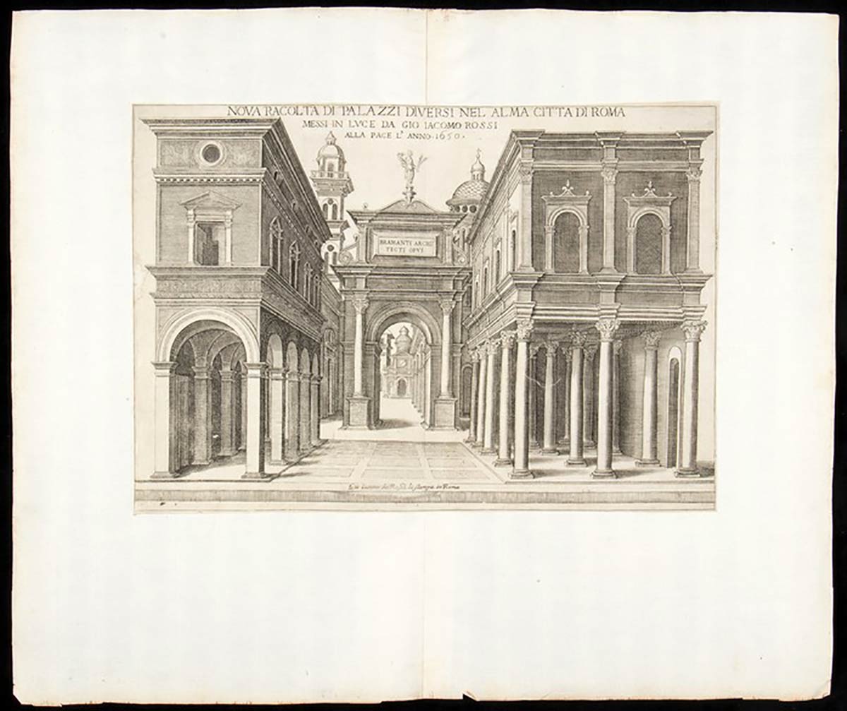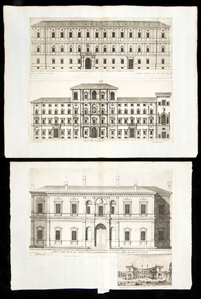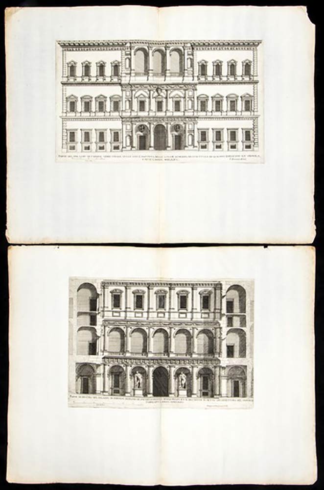 Dettaglio lotto: doppia tavola: Frontespizio BRAMANTI ARCH ITECTI OPVS, Parte del Palazzo Farnese verso strada Giulia ..., Questo Palazzo ... ( prospetto Palazzo Farnese verso Piazza Farnese) , Parte di dentro del Palazzo Farnese ..., detto Palazzo ( a Piazza Fontanelle Borghese ndr) lo fece fare il Cardinale Dezza ..., Palazzo del Cardinale Alessandrino nella pIazza de SS. Apostoli ..., Palazzo de s S.Gaetani al Corso ..., Palazzo della Sapienza et Studio di Roma ..., Palazzo fabbricato dal cardinale Capodiferro ..., Palazzo de gli Ecc.mi Sig.ri Barberini ..., Palazzo de Ghigi alla Lugara ..., tavole con due prospetti diversi, controfondate sul foglio doppio: Palazzo di Madama del SerenissimoGran Duca di Toscana ... + Palazzo delli SS Coronari alla Fontana di Trevi ..., Palazzo de SS.ri Torres posto in Piazza Navona ... + La facciata del Palazzo del Dvca di Ceri alla Fontana di Trevi ..., Palazzo dei SS.ri Mattei alle Botteghe Scvre ... + Palazzo in Laterano eretto da fondamenti ..., Palazzo della Cancelleria ... + Disegno del Palazzo dell Ill.mo et Ecc.mo SS Panphilii posto in Piazza Navona ... ; Palazzo dei SSri. Caffarellli alla Valle ...+Palazzo dei SS.ri Salvieti alla Longara ... Disegno del Palazzo delle Vigna Giulia posto fvori Popolo ... ( più piccola veduta di Israel con veduta de l'interno del Palazzo di Papa Giulio), tavola pagina singola: Palazzo de SS MVTI de Papazzvrri.