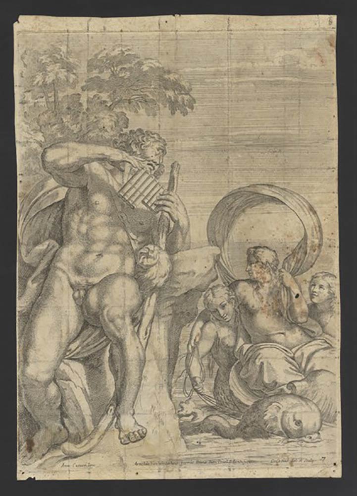 tratta dall'opera "Galeria nel Palazzo Farnese in Roma.del Sereniss. Duca di Parma etc. dipinta da Annibale Carracci intagliata da Carlo Cesio", stampata a Roma 1657. Il Ciclope Polifemo, segretamente innamorato della Nereide Galatea, cerca di attirare la sua attenzione con il suono del flauto