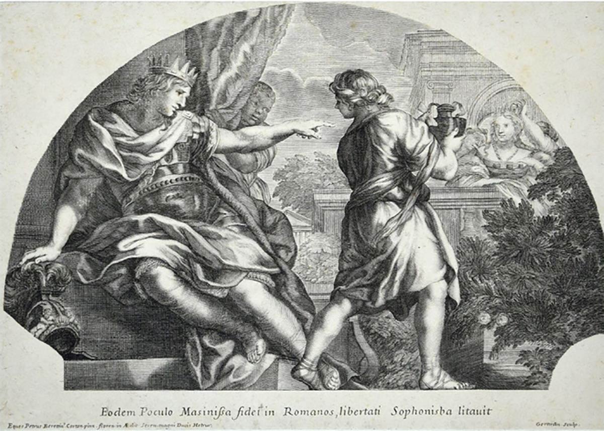 L'opera rappresenta la storia di Massinissa e Sofonisba, un episodio storico dei due giovani innamorati, vissuti nel III secolo a.C. a Cartagena. La giovane figlia di Asdrubale, il comandante cartaginese, fu costretta a sposare il nemico di Massinissa, il re di Numidia, Siface. La scena raffigura a sinistra il re Massinissa ed è tratta da un'opera realizzata dall'artista italiano Pietro da Cortona (Cortona, 1596 - Roma, 1669). La stampa è stata incisa dall'artista francese Jean Gérardin, attivo dal 1650 al 1680.