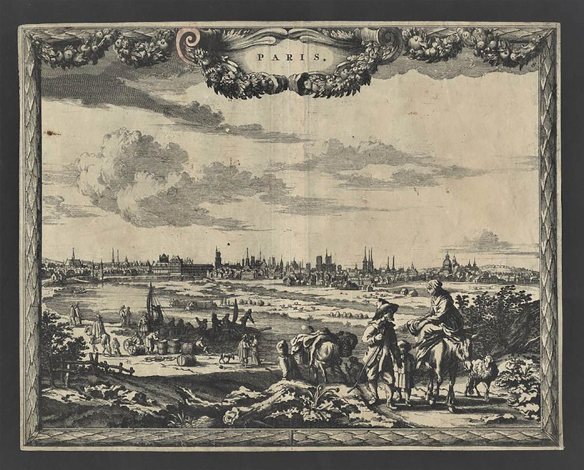veduta dalla campagna con vandanti sulla strada lungo la Senna. Paesaggio dei dintorni con la città di Parigi sullo sfondo, con figure e perosnaggi lungo la Senna nella direzione della città; bella cornice con ghirlande floreali nella parte superiore a formare il cartiglio del titolo
