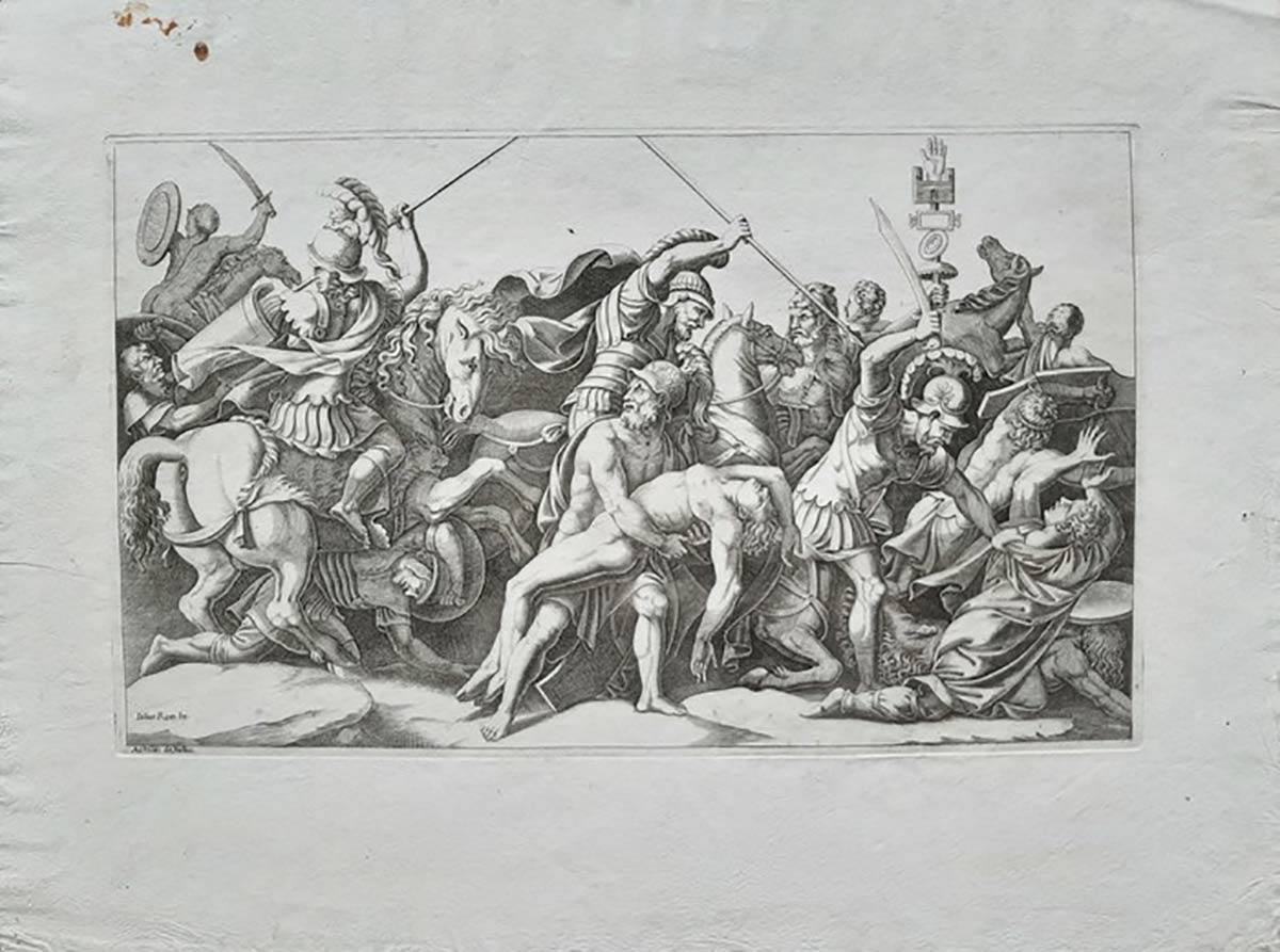 L’incisione riprende, arricchendolo di figure, un affresco da un disegno di Giulio Romano realizzato nella Sala di Troia di Palazzo Ducale a Mantova da Fermo da Caravaggio tra il 1538 e il 1539. Il soggetto deriva da un rilievo romano che era conservato nello stesso Palazzo ducale. Questa incisione è considerata una delle migliori prove di Diana Scultori. Al centro della scena il corpo di Patroclo tra le braccia di Menelao mentre attorno infuria la battaglia. In basso a sinistra “Iulius Roma. inv.” e più sotto “Achilles defuctus”. Carta filigranata inizio XVIII secolo. Piccola macchia in alto a sinistra nel margine bianco. Bell’impressione buoni margini. (vedi Stefania Massari a cura di, Incisori mantovani del ’500. Giovan Battista, Adamo, Diana Scultori e Giorgio Ghisi, dalle collezioni del Gabinetto Nazionale delle Stampe e della Calcografia Nazionale, Roma, De Luca Editore, 1981, pp. 89-90 n. 145).