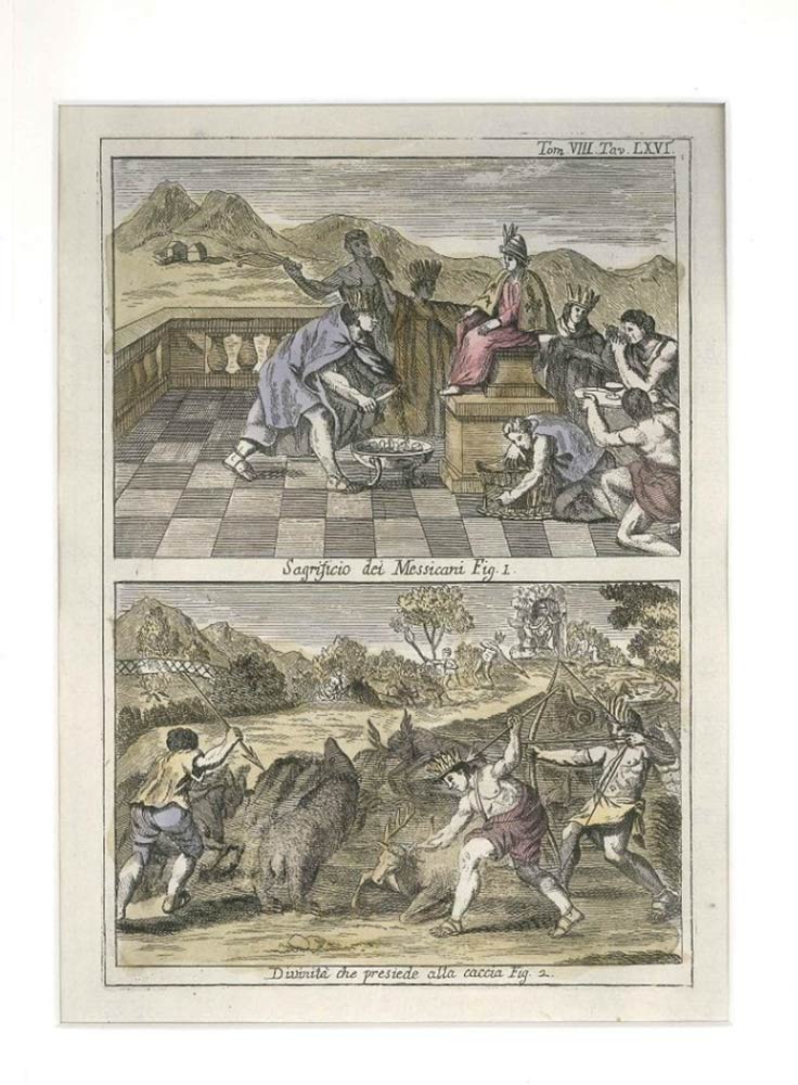 "Sacrificio dei messicani, Divinità presiede la caccia" è una pregevole acquaforte, acquarellata a mano. Rappresenta i tipici riti messicani del sacrificio umano e della caccia. Tratta dalla serie "Nuovo dizionario scientifico e curioso del Sacro e del Profano" (tomo VIII, tavola LXVI), pubblicata da Benedetto Milocco a Venezia nel 1746-1751, riguardante i costumi e i riti religiosi dei vari popoli. Condizioni perfette, passepartout compreso.