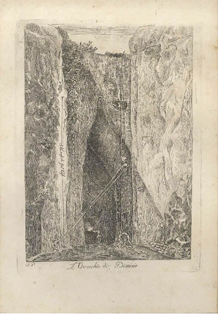 Acquaforte in bianco e nero molto minuziosa di un artista della scuola italiana del XVIII secolo. Monogramma "MP" e titolo su lastra sul margine inferiore.Questa preziosa stampa rappresenta la grotta sotto il famoso Teatro Greco di Siracusa (Sicilia, Italia), chiamata Latomia del Paradiso. La rappresenta in modo molto dettagliato, riportando anche le misure realistiche.