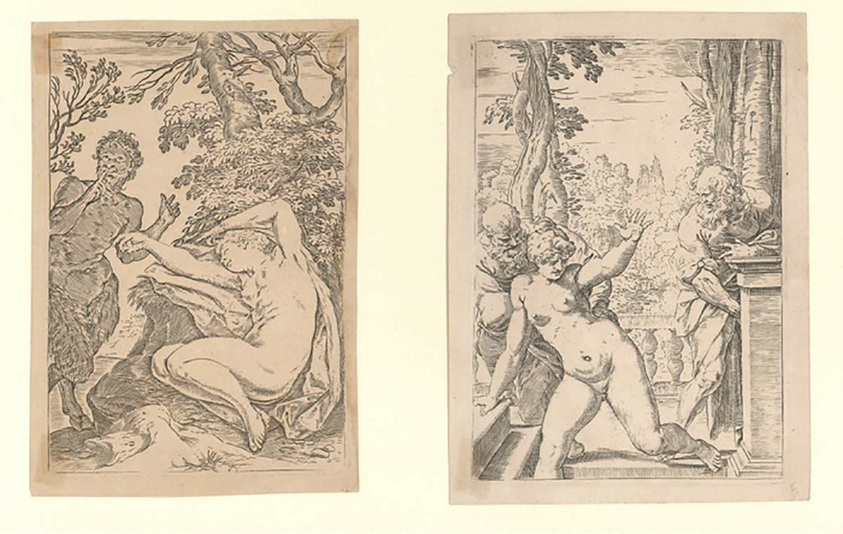 Bellissima doppia composizione raffigurante due celebri opere d'arte realizzate dal pittore italiano Agostino Carracci (1557-1602).La scena Satiro e Ninfa è dalla collezione di Ollivier (1898), mentre la scena con Susanna e i Vecchioni è dalla collezione di Lion Millet (1896). Entrambe le opere furono realizzate nel XVI secolo da Agostino Carracci, e le tavole sono di un'edizione della fine del XVIII secolo. Ottime condizioni.