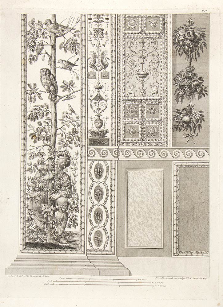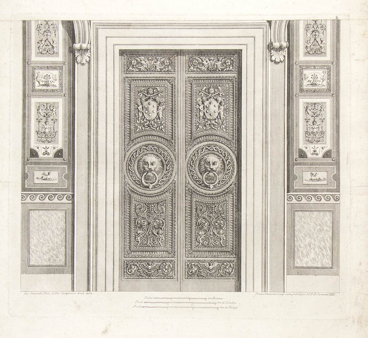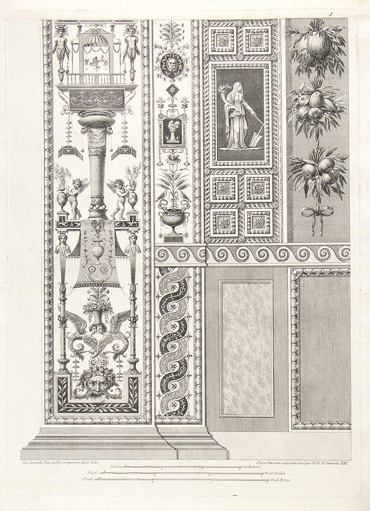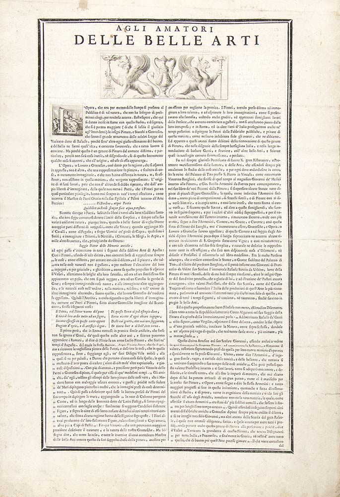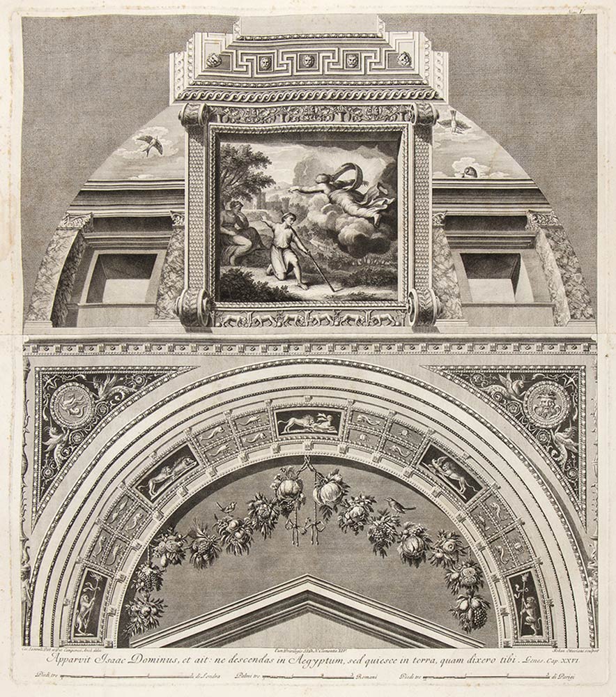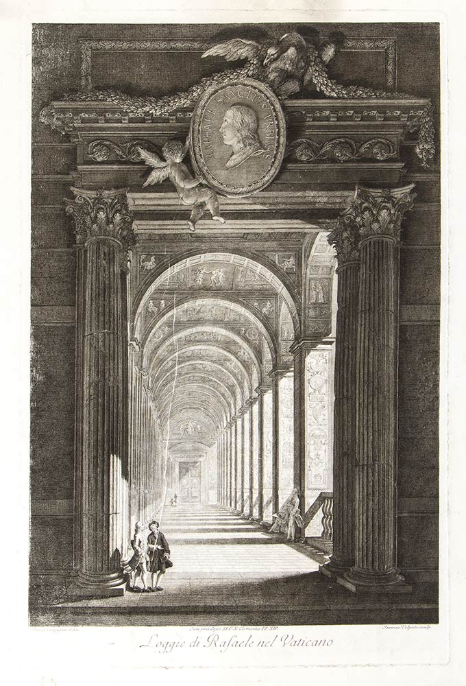 Una raccolta di incisioni che illustrano le Logge vaticane affrescate da Raffaello, di particolare rarità e pregio. Realizzata da Giovanni Volpato (1735-1805) dal 1772 a 1776, divisa in tre parti, per un totale di 56 tavole, di cui questa raccolta contiene le parti I e II (in due volumi separati), per un totale di 33 tavole. La prima è il frontispizio raffigurante la veduta delle Loggie, con le iscrizioni: Petrus Camporesi delin./ Cum privilegio SS. D. N. Clementis PP. XIV/ Joannes Volpato Sculp./ Loggie di Rafaele nel Vaticano. Seguono le tavole incise da Givanni Ottaviani (1735-1808) su disegni di Pietro Camporese (1763-1822) e Gaetano Savorelli (morto nel 1791), rappresentanti due porte (tavole A e B) e gli ornamenti (tav. I-XIV). Il secondo volume contiene le tavole dei volti (tav. I-XIII). Iscrizioni: Cai. Savorelli Pict. et Pet. Camporesi Arch. delin. / Joann. Ottaviani sculp. cum privilegio SS. D. N. Clementis XIII.