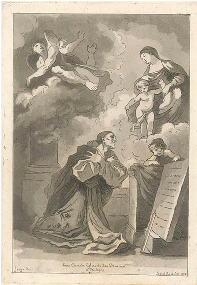 Raffigura il dipinto "Apparizione della Vergine a San Giacinto" realizzata da Ludovico Carracci per la chiesa di San Domenico a Bologna (ora al Louvre). Si presenta in ottime condizioni, salvo un consueto ingiallimento e qualche lieve macchia sulla carta oltre la linea marginale della matrice. Passepartout in cartoncino bianco incluso.