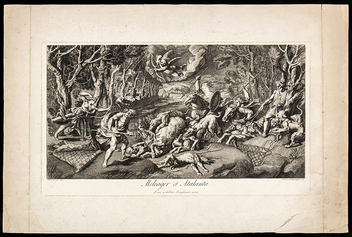 tratta dagli affreschi di Gulio Romano, stampata a Roma 1772. Il mito racconta che le terre di Calidone erano infestate da un terribile ed enorme cinghiale, inviato da Artemide offesa perchè non era stata onorata dopo un abbondante raccolto. L'enorme animale terrorizzava la regione e nessuno riusciva ad abbatterlo. Allora il Re chiese a tutti i più valorosi guerrieri di cimentarsi nell'impresa, e tra loro arrivo la bella e valorosa Atalanta di cui Meleagro, benchè già sposato, si innamorò. Insieme riuscirono ad uccidere il cinghiale alla fine di una battuta di caccia, prima con una freccia di lei e poi con un colpo di lancia al cuore di lui.
