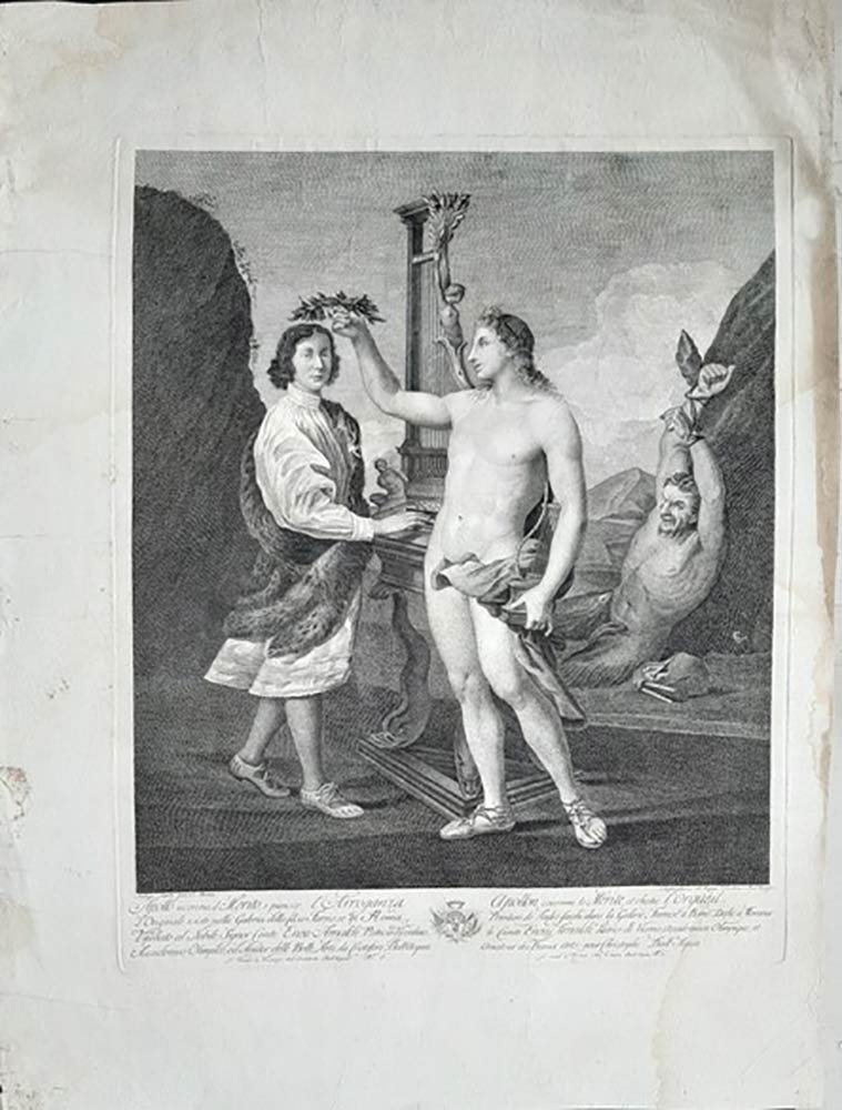 L’incisione riproduce in controparte il soggetto di un dipinto di Andrea Sacchi, con un ritratto allegorico del cantante Marcantonio Pasqualini (1614-1691). Apollo incorona con un serto di alloro un giovane intento a suonare un organo, mentre a destra il satiro Marsia che aveva sfidato il dio giace legato. In basso fuori inciso lunga iscrizione dedicatoria in italiano e francese. Bell’esemplare marginoso in ottimo stato di conservazione.