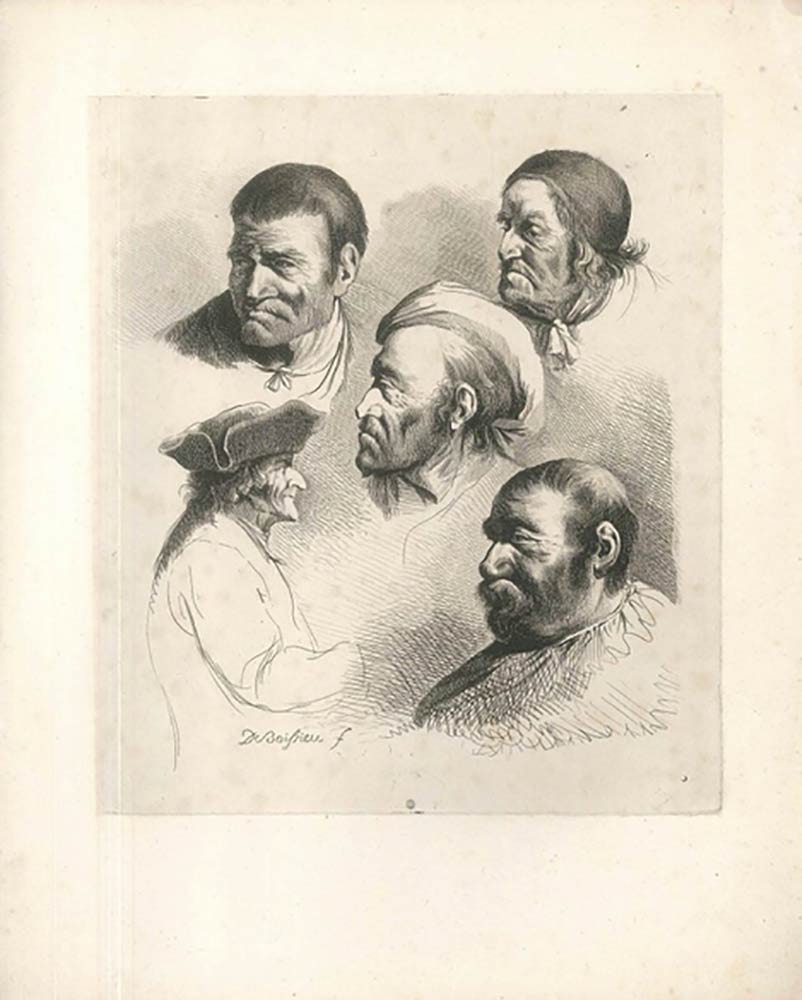 Rappresenta cinque studi di teste, dei quali tre sono i profili maschili. I due ritratti in alto sono leggermente rivolti verso sinistra. Ogni ritratto rappresenta un uomo anziano, sdentato e con un grosso naso, e dimostra la superba maestria dell'artista e l'incredibile realismo della stampa. Anche se i soggetti sono disegnati in diverse dimensioni e gradi di finitura, ogni ritratto può essere considerato un'opera d'arte di per sé.