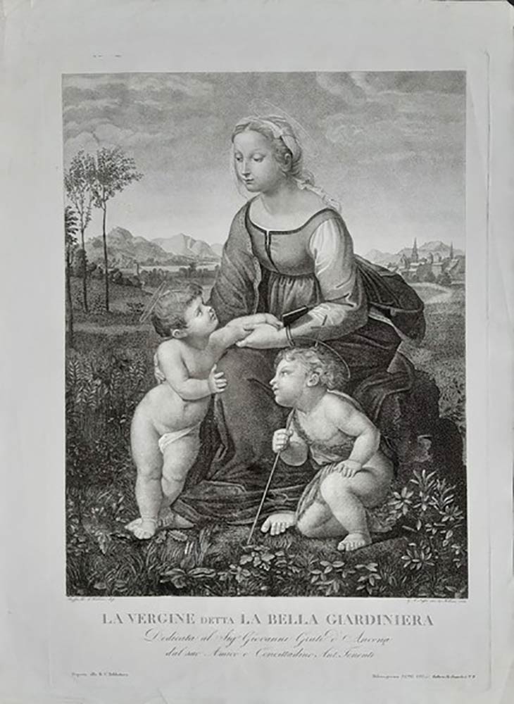 L’incisione riproduce nello stesso verso il dipinto di Raffaello detto La Bella Giardiniera per il prato fiorito alle spalle della Madonna, oggi conservato al Louvre.