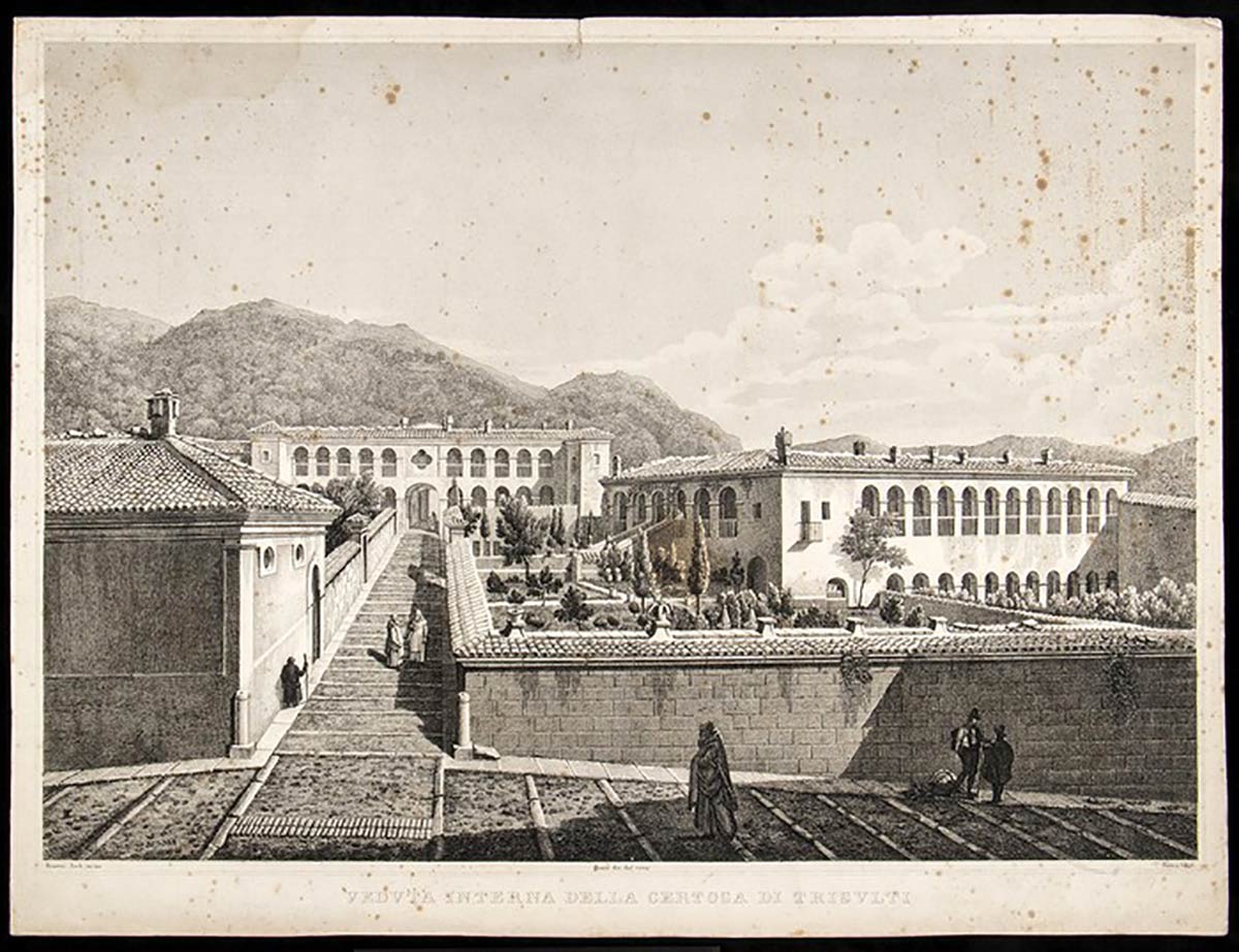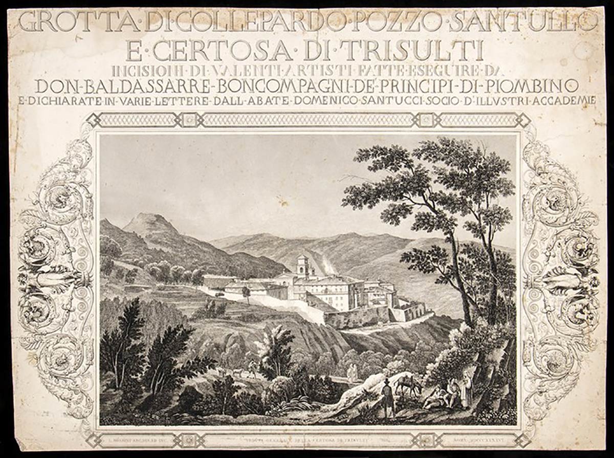 tratta da Grotta di Collepardo Pozzo Santullo e Certosa di Trisulti : incisioni di valenti artisti fatte eseguire da Don Baldassarre Boncompagni de Principi di Piombino e dichiarate in varie lettere dall'Abate Domenico Santucci socio d'illustri accademie incisa da Luigi Rossini- Roma 1846. Grande frontespizio dell'Opera con la veduta d'insieme della Certosa di Trisulti nella provincia di Frosinone (Lazio), incisa da Luigi Rossini (1790-1857) il maggiore incisore romano del XIX secolo, erede artistico del Piranesi. La veduta è arricchita da una cornice decorativa con volute e grottesche