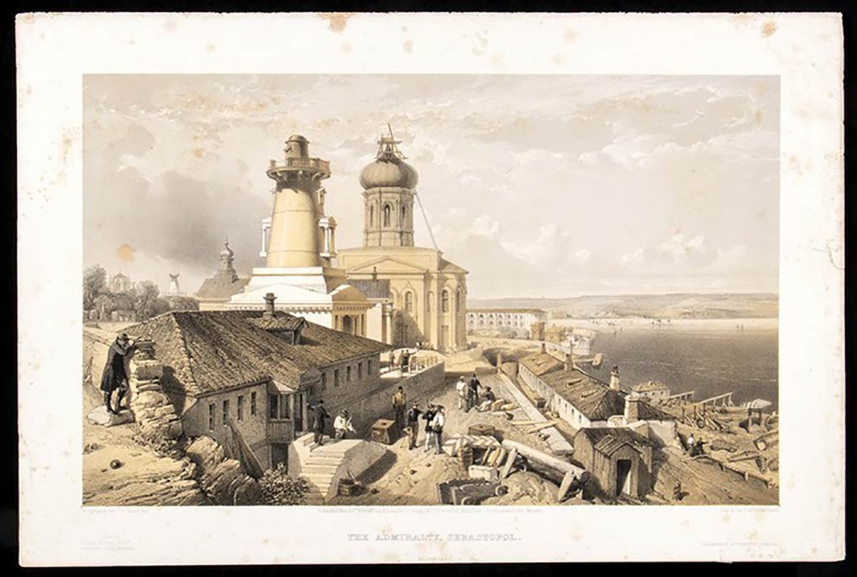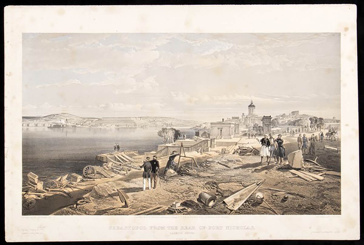 coppia di litografie stampate in seppia con affascinante colororitura all'acquarello; da disegni di W. Simpson (1823-1899), E. Walker lith. ; stampata da Day & Son, Lithrs. to the Queen; pubblicata a Londra da y Paul & Dominic Colnaghi & Co., 1855. Veduta della città e del Porto meridionale dal Fort Nicholas, durante l'occupazione francese ed inglese, non appena i Russi abbandonarono la città. Altra veduta dal lato dell'Ammiragliato