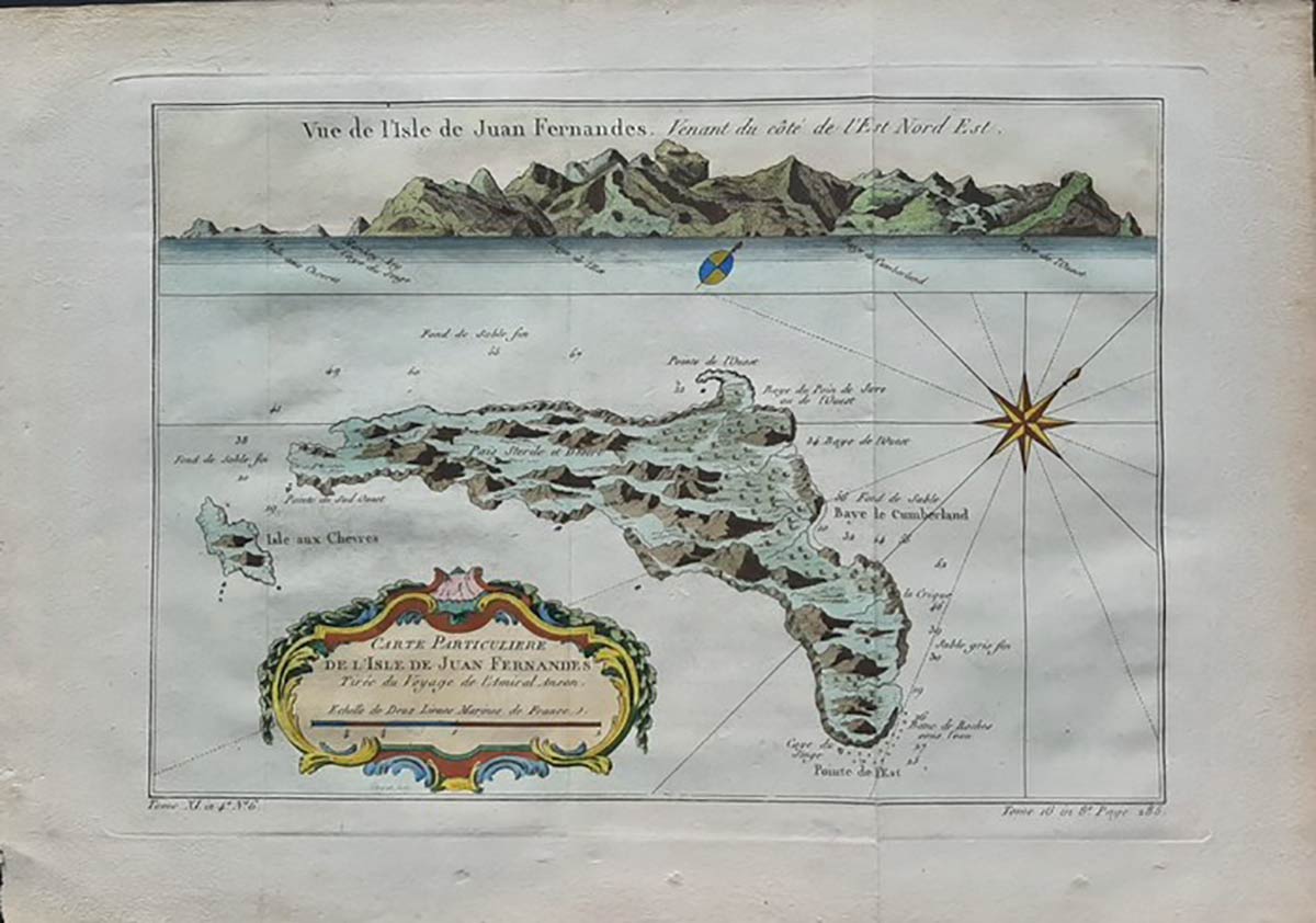 Bella carta nautica ritraente le isole di Juan Fernandes, colorata, marginosa e in perfetto stato di conservazione.