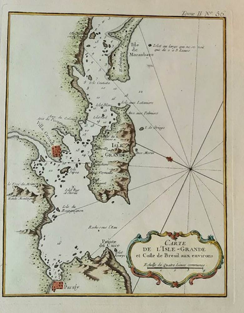 Bella carta nautica ritraente l’Isola grande e coste periferiche del Brasile, colorata, marginosa e in perfetto stato di conservazione.