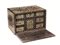 Scrigno da viaggio, fine sec. XIX, in legno intarsiato ad elementi geometrici e fiori stilizzati, due prese laterali in ferro, interno con otto cassettini, cm 33x24x21
