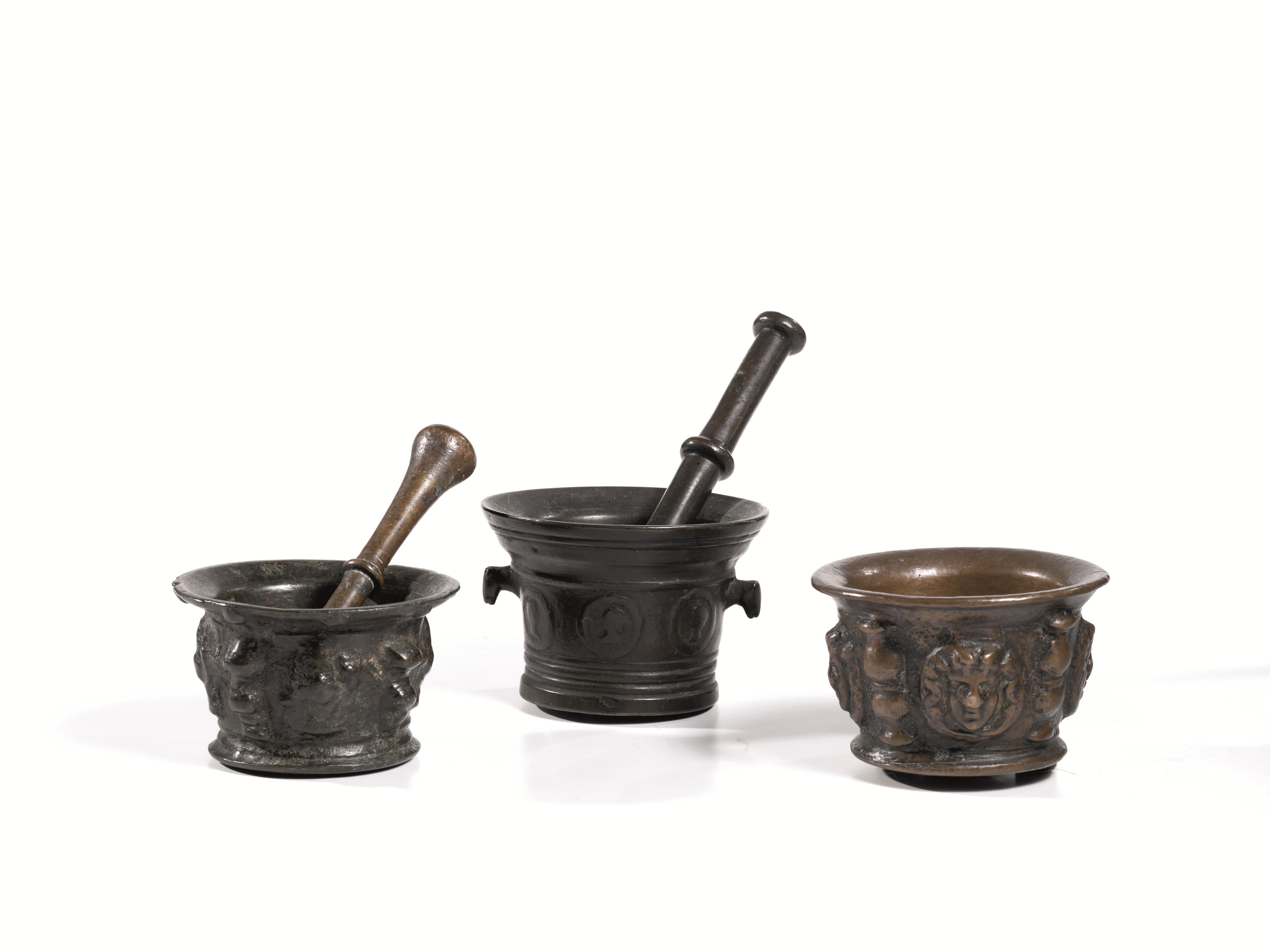 Lot 13 | Tre mortai, secc. XVI-XVII, in bronzo lavorato in bassorilievo...