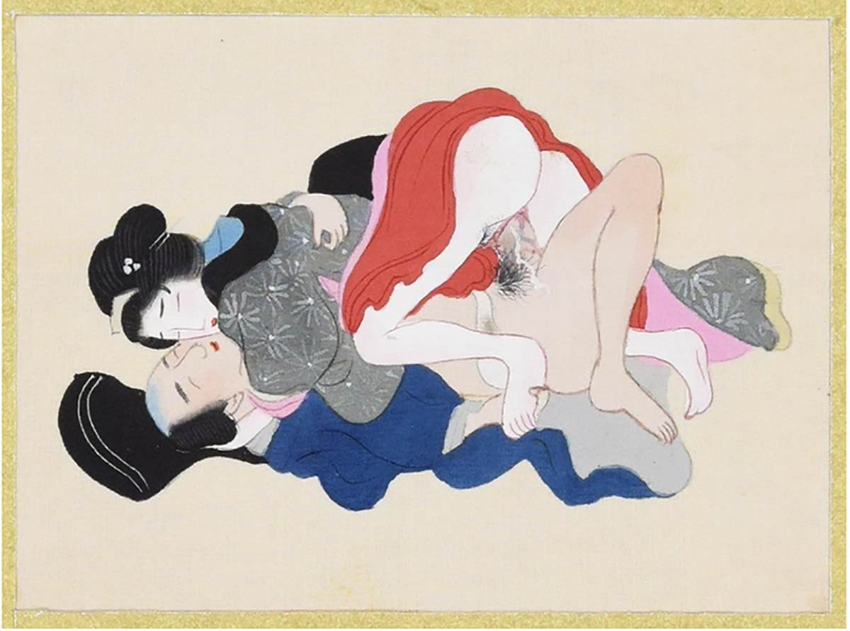 Da una serie di dodici dipinti erotici su seta giapponesi, erroneamente intitolati "Shunga". Con passepartout di cartone giallo.
