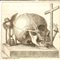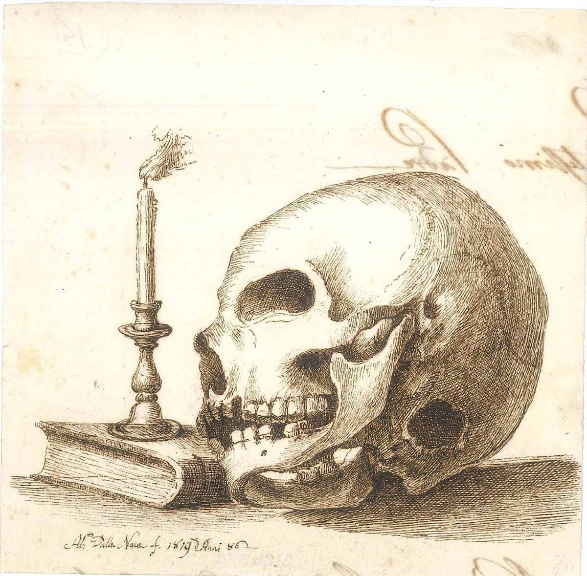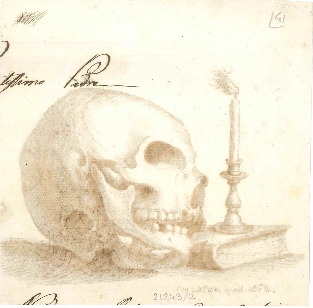 "Teschio con candela e un libro" è un meraviglioso disegno a penna e inchiostro di china marrone su carta filigranata vergata bianca. Iscrizione a penna e china marrone in basso a sinistra "Al.ro Dalla Nave f. 1819 e Anni 86". Un teschio è mostrato di profilo vicino a una candela accesa, appoggiata su un libro. Quasi tutti i simboli della vanitas sono rappresentati anche in questo disegno originale, fresco e affascinante. Questo prezioso disegno è in ottime condizioni. Alcune scritte autografe al verso sono visibili in trasparenza.