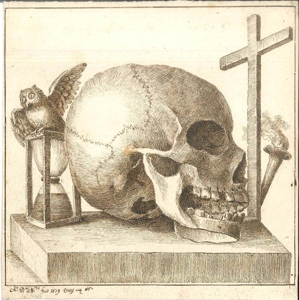 "Teschio con clessidra e gufo" è un meraviglioso disegno a penna e inchiostro marrone su carta vergata bianca. Monogramma e iscrizione a penna e inchiostro di china bruno sul margine inferiore sinistro "A. D. N. fecit 1819 etatis suae 86". In ottime condizioni, salvo una impercettibile macchia scura al centro e consueto ingiallimento della carta sui bordi. Un teschio è raffigurato di profilo, con estrema attenzione all'anatomia, poggiato su un supporto pieghevole, vicino a una clessidra con un gufo sopra. A destra del teschio, una croce e una torcia. Questi sono i simboli di vanitas, rappresentati in questo disegno.