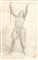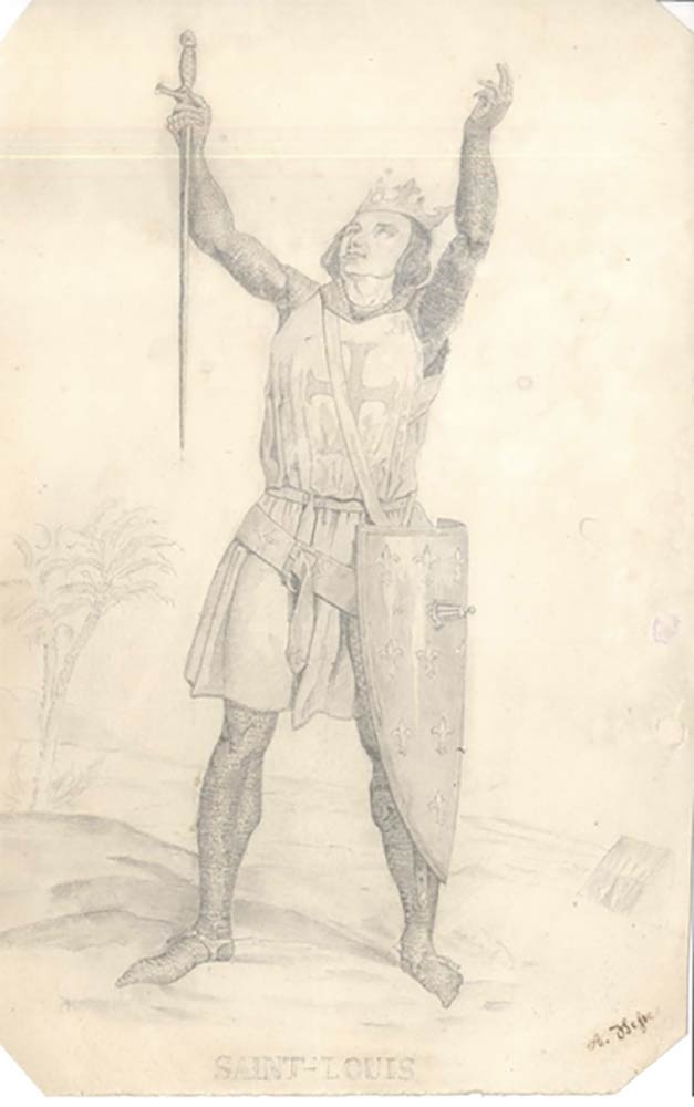 L'opera rappresenta lo Chevalier Saint-Louis ringraziando Dio con le braccia alzate al cielo. Il disegno dimostra una grande maestria. In buone condizioni, salvo un consueto ingiallimento della carta ai bordi e qualche lieve macchia sul margine inferiore. Sul retro timbro a inchiostro nero: "Documento appartenente a Georges Cheron peintre decorateur".