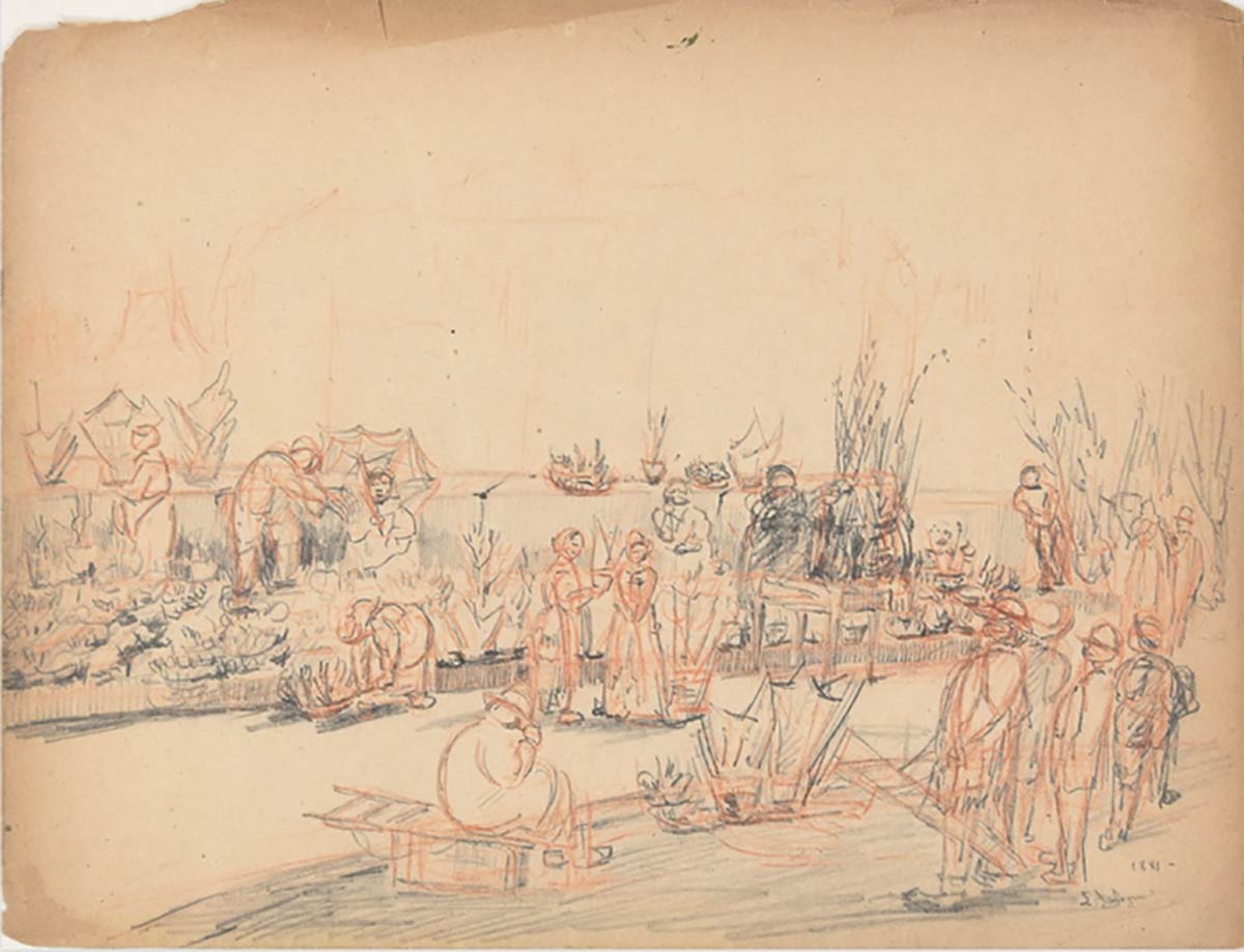 Opera d'arte originale realizzata nel 1881. Matita e matita colorata su carta. Datata e firmata a mano in basso a destra. Discrete condizioni. Danni nell'angolo in alto a sinistra.