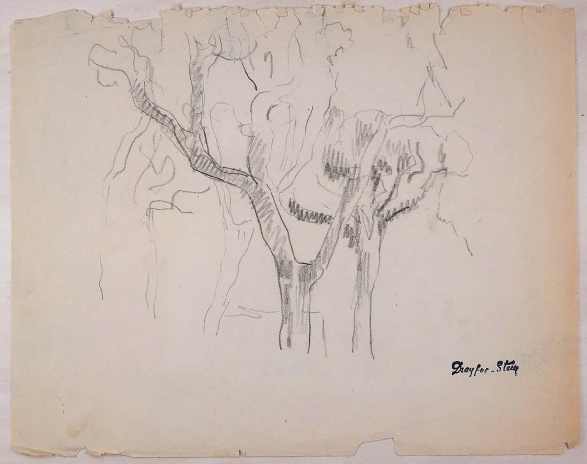 Disegno originale realizzato da Jean Dreyfus-Stern negli anni '20. Matita su carta. Il nome dell'artista appare nell'angolo inferiore destro. Pessime condizioni. Abrasioni ai margini e agli angoli. Schizzo rapido in bianco e nero rappresentante un grande albero.