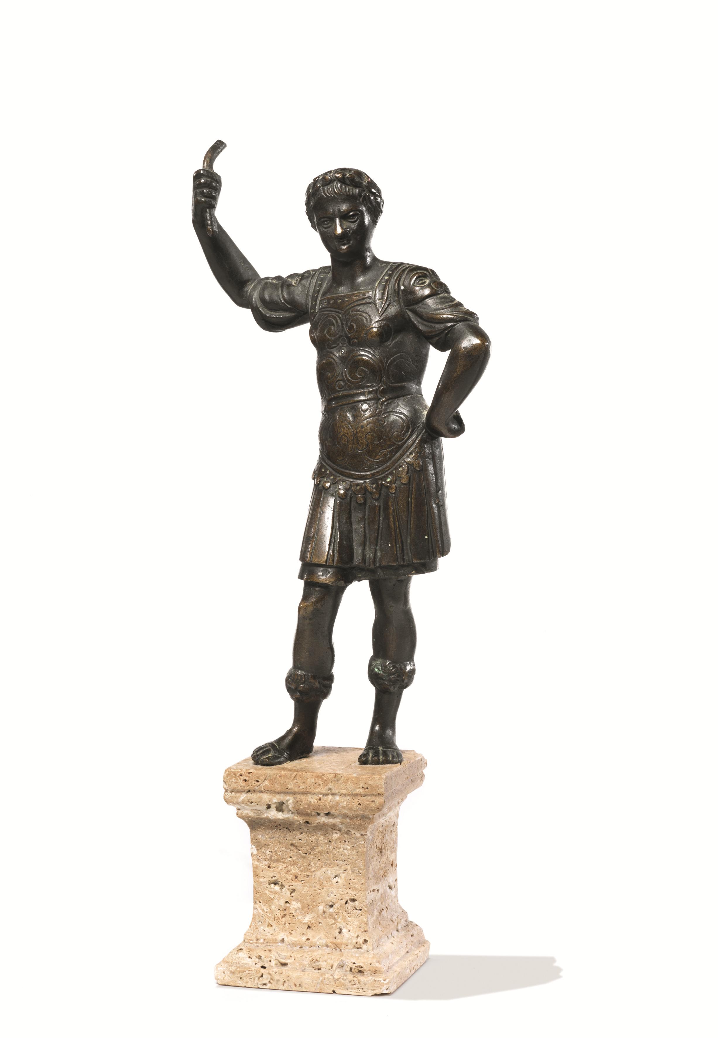 Bronzetto, sec. XVIII, Figura di Imperatore, alt. cm 24, su base a plinto in travertino, un braccio restaurato