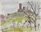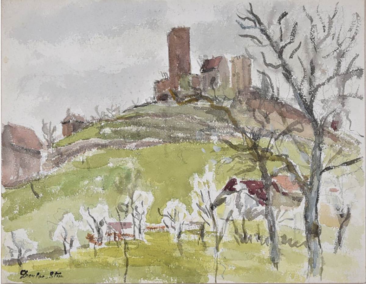 Disegno a carboncino ed acquerello su carta realizzato da Jean Dreyfus-Stern nei primi decenni del XX secolo. La firma dell'artista è presente nell'angolo inferiore sinistro. Buone condizioni. Questa bozza rappresenta un paesaggio montano verdeggiante e lussureggiante con dei edifici. La composizione è molto fresca, i colori sono tenui.
