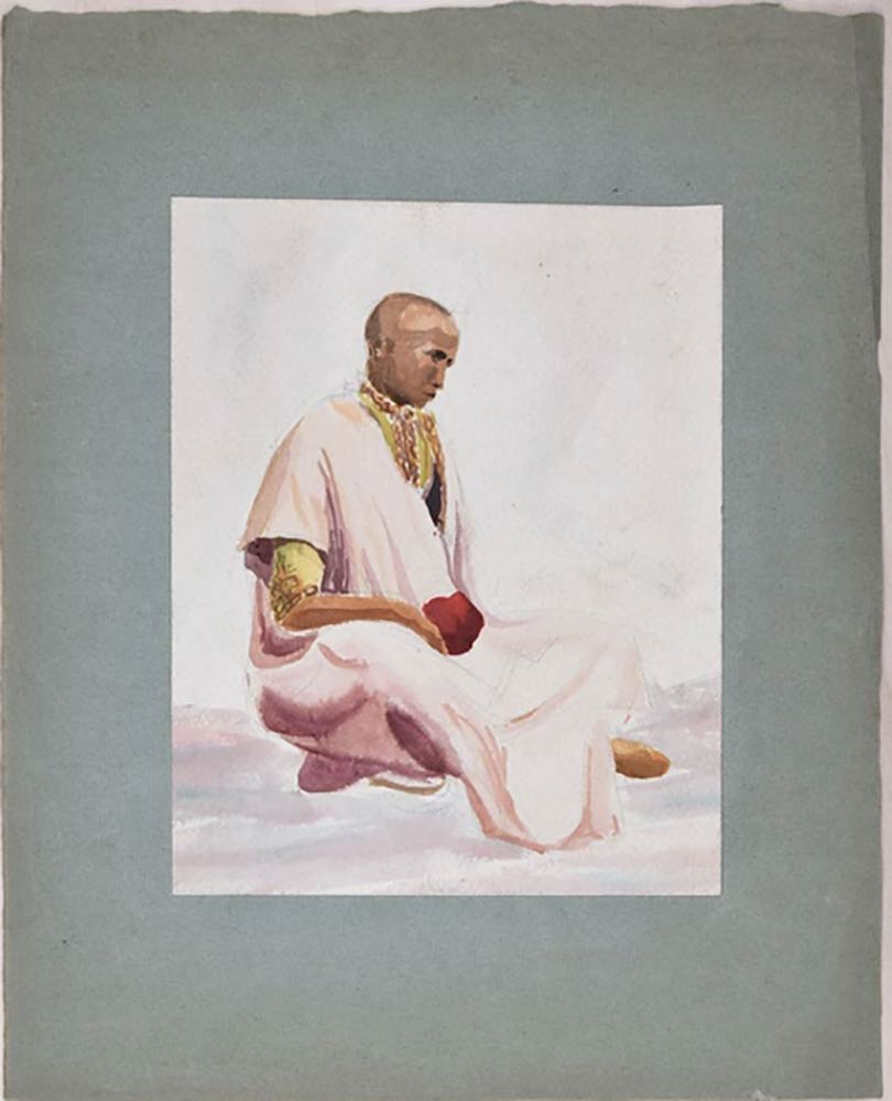 Colorata composizione raffigurante una figura seduta con tipici abiti nordafricani.