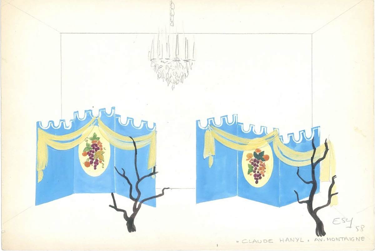 Opera d'arte originale realizzata da Esy Beluzzi nel 1958. Tempera su carta. Firmata e datata a matita in basso a destra. Iscrizione in lettere maiuscole, a matita, nell'angolo inferiore destro: ""Charles Hanyl" Av. Montaigne". Buone condizioni.