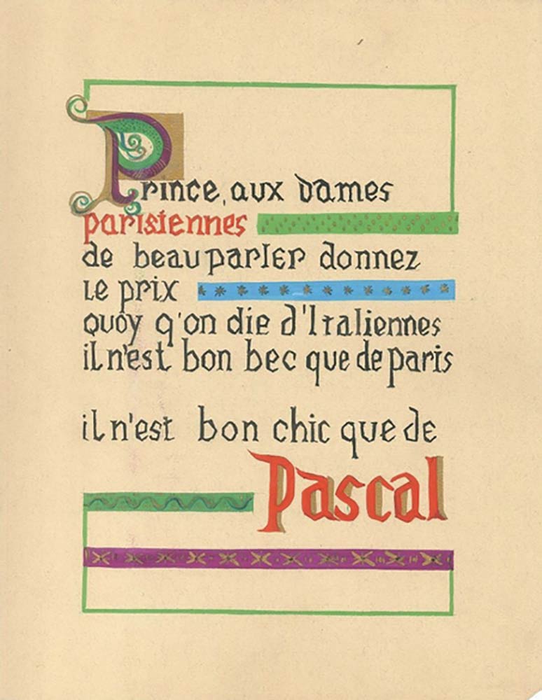 Questa opera presenta due fogli di un manoscritto stilizzato. Entrambi dei fogli sono scritti con le lettere gotiche. La prima lettera maiuscola è decorata e colorata.