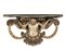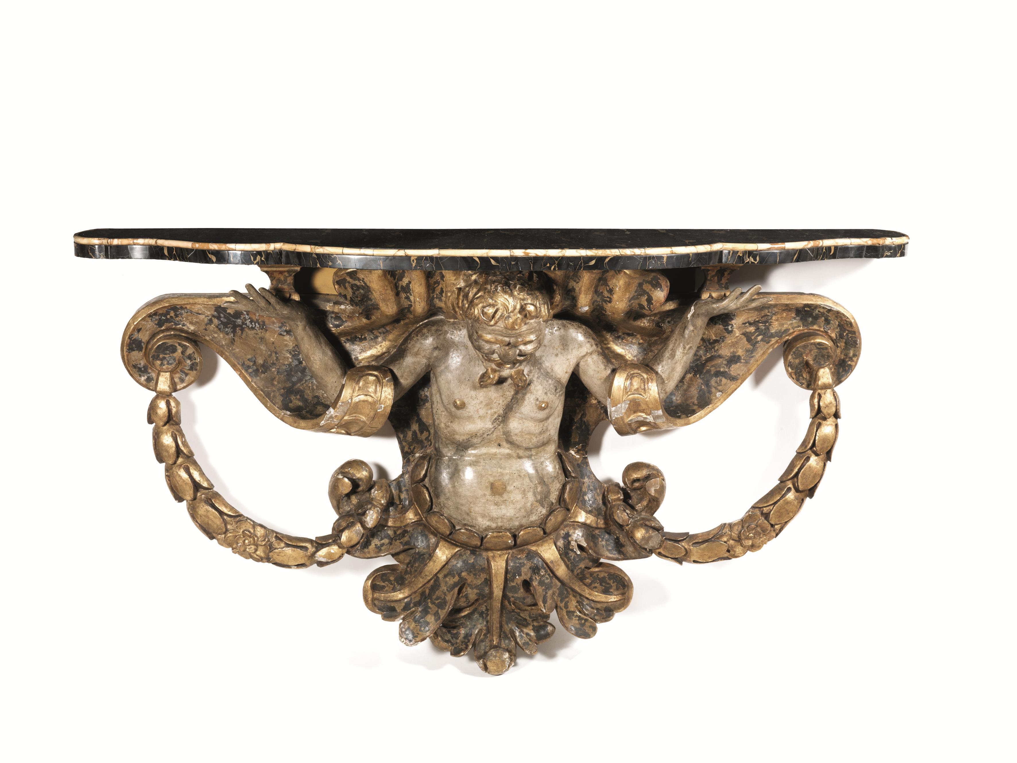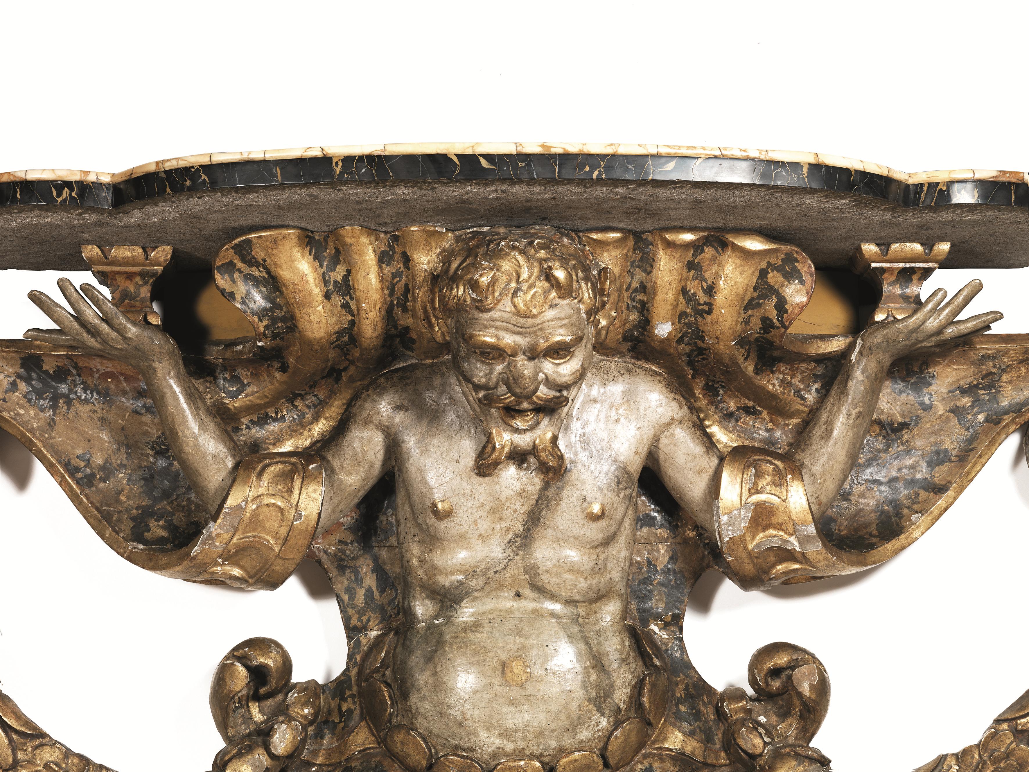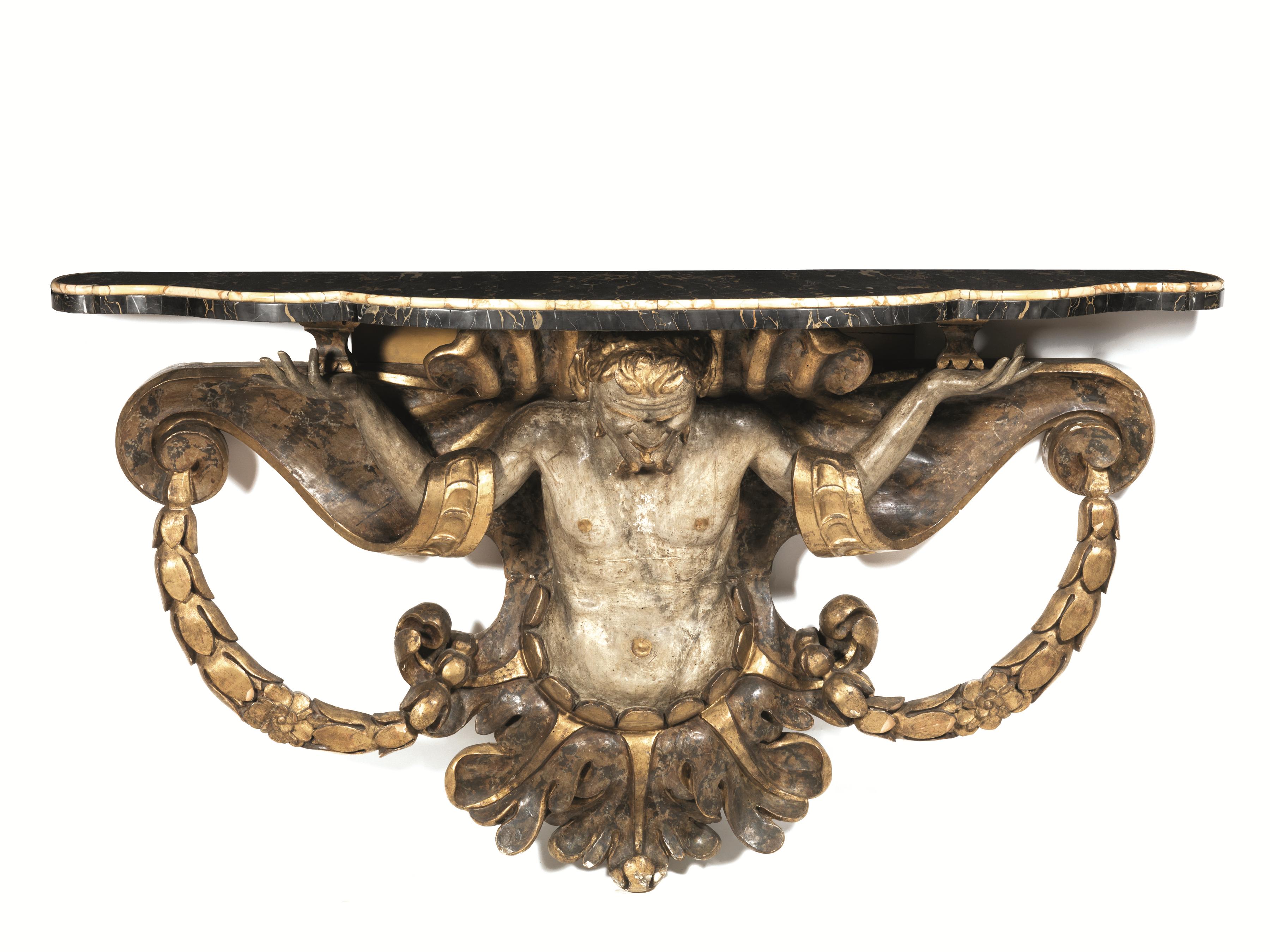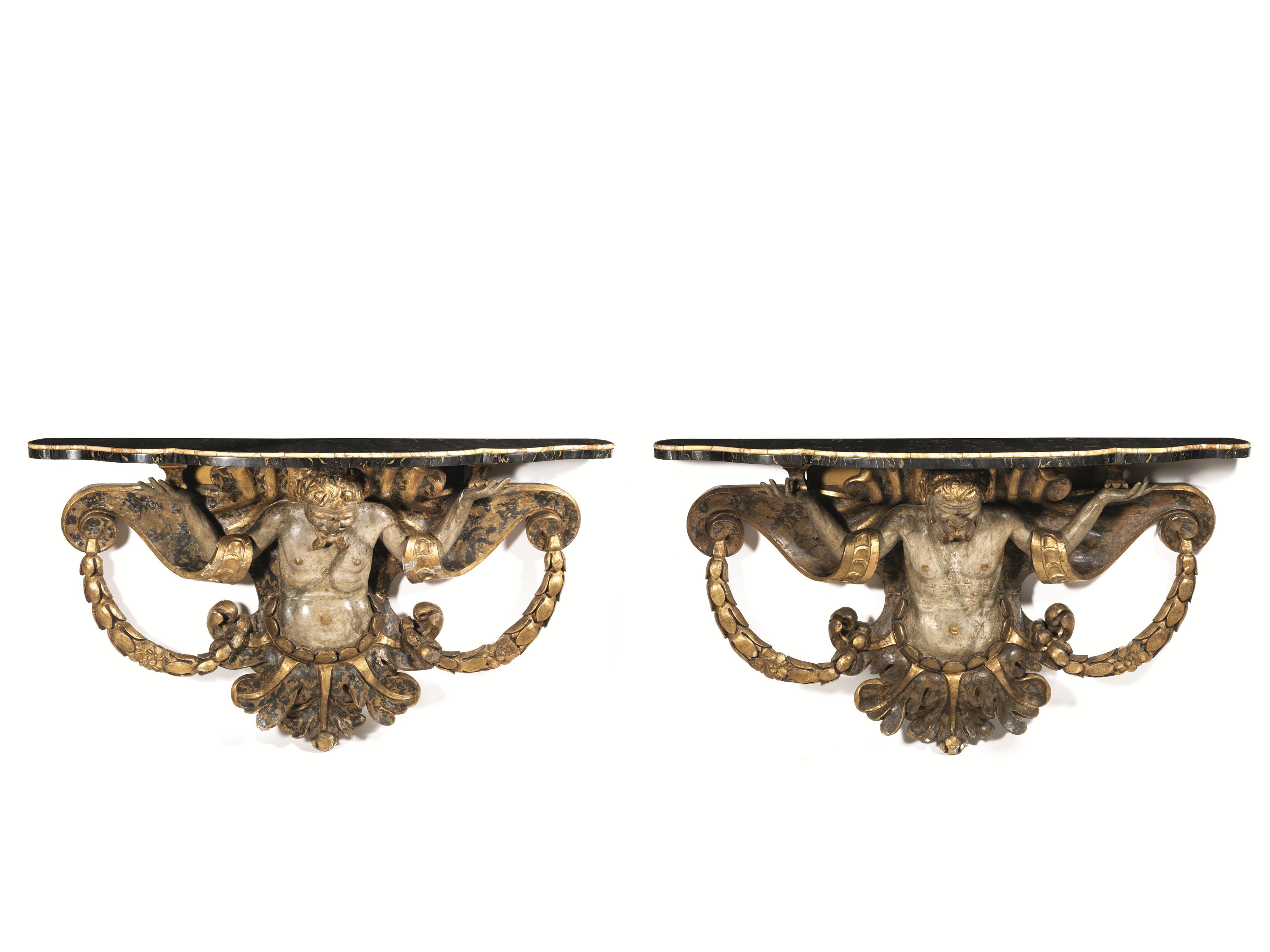 Coppia di grandi consoles, Italia centrale, sec. XVII, in legno scolpito, dipinto e in parte dorato in forma di telamoni nudi e ghignanti con la schiena appoggiata ad una conchiglia con festoni pendenti. Le braccia sollevate a sostenere il piano in marmo portoro con profilo in giallo di Siena di epoca posteriore, cm 168x40x96, un piano in marmo con restauro, tre festoni di restauro (2)