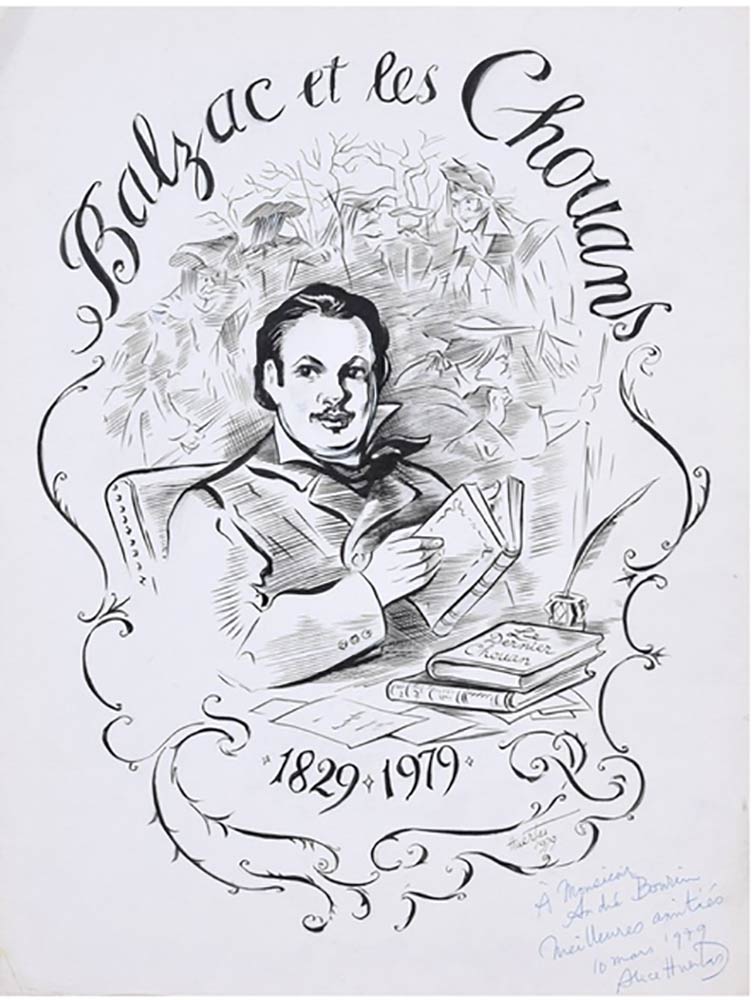 Bello e intenso ritratto rappresentante la figura di Honorè de Balzac con le sue opere principali. Sul margine superiore il grande titolo con le date "1829" e "1979" (1829 è la data della pubblicazione di "Les Chouans" e 1979 è la data di realizzazione del disegno). Una cornice decorativa circonda l'intera composizione.