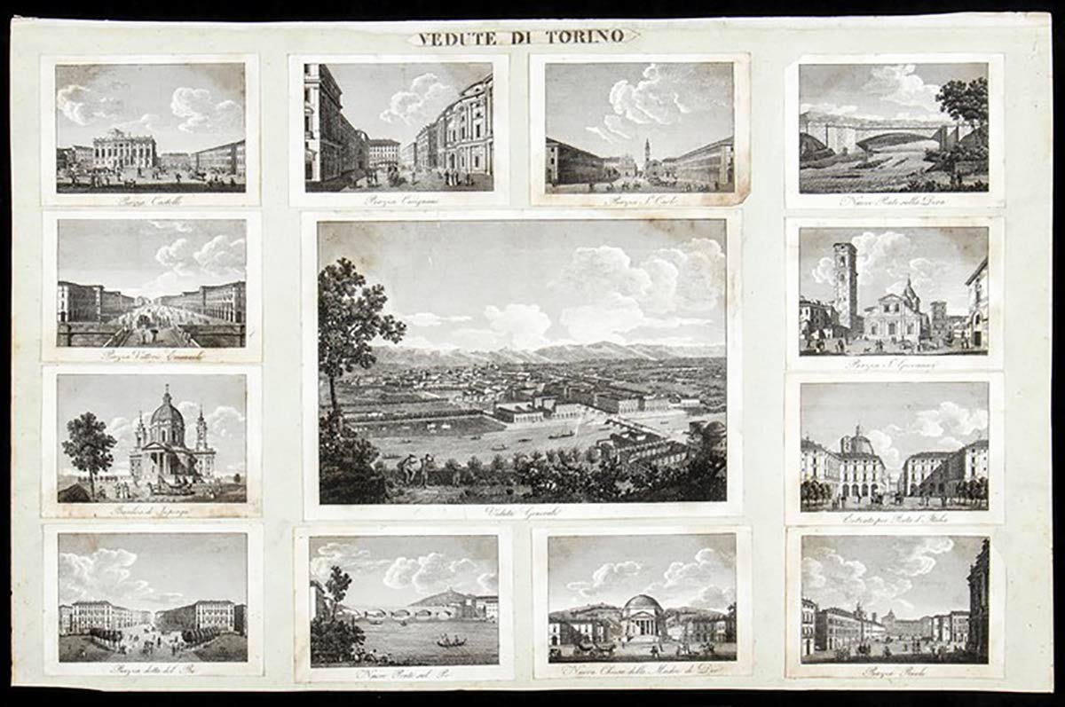 grande foglio d'album con 12 vedute piccole e 1 veduta media: Veduta generale, Piazza Castello, Piazza Carignano, PIazza S. Carlo, Nuovo ponte sulla Dora, PIazza S. Giovanni, Entrata per Porta d'Italia, PIazza Reale, Nuova CHiesa della Madre di Dio, Nuovo ponte sul Po, Piazza detta del RE, Basilica di Superga, Piazza Vittorio Emanuele; stampate a Torino 1810ca. ed incise da FEDERICO LOSE (1776-1833)