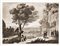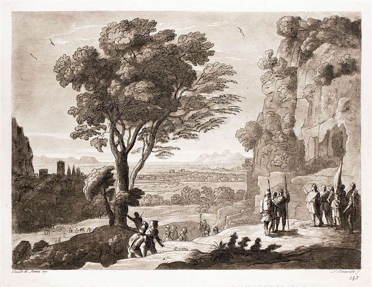 Acquaforte e acquatinta su carta incisa dall'artista italiano Ludovico Caracciolo (incisore), dal disegno del pittore francese Claude Lorrain (disegnatore). Prova d'autore, avant la lettre. Tratta dalla serie "Liber Veritatis", pubblicata a Roma nel 1815 da Francesco Bourlié. Rappresenta un meraviglioso paesaggio naturale con soldati. Firmata e numerata su lastra, in basso: “Claudio di Lorena inv., L. Caracciolo F.”. In ottime condizioni, con normale, lieve brunitura della carta ai margini. Compreso il passepartout.