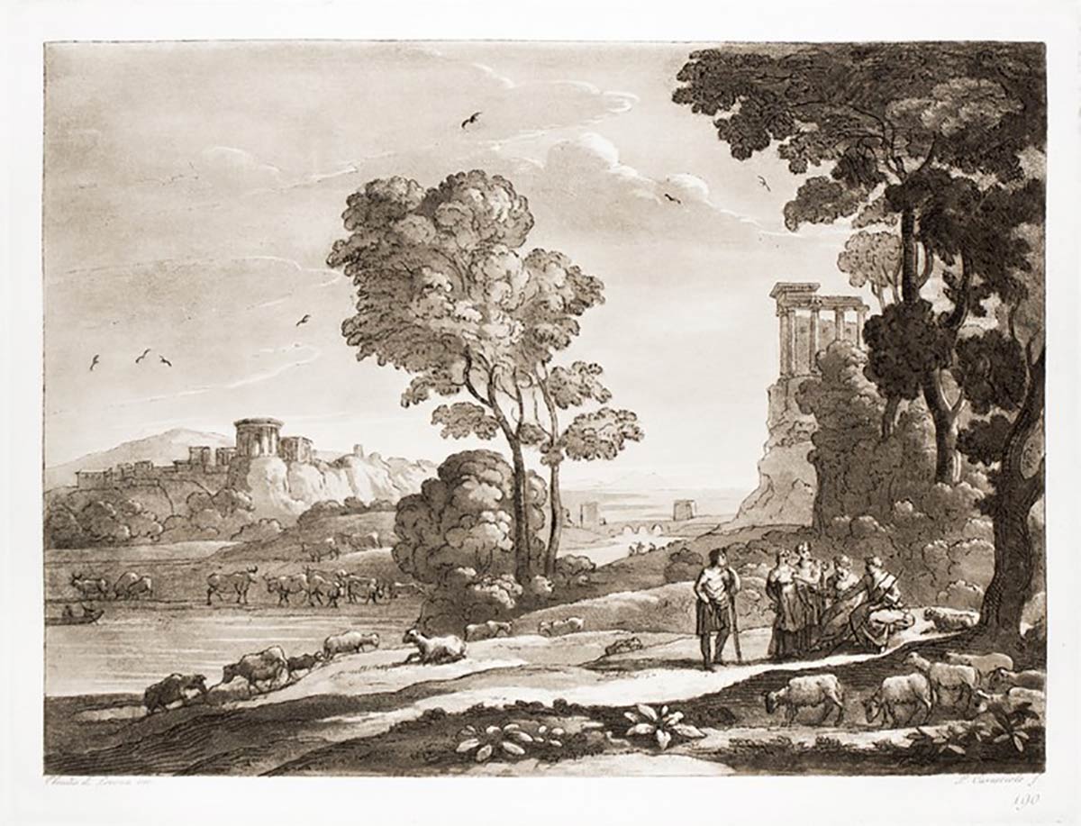 Acquaforte e acquatinta su carta incisa dall'artista italiano Ludovico Caracciolo (incisore), dal disegno del pittore francese Claude Lorrain (disegnatore). Prova d'autore, avant la lettre. Tratta dalla serie "Liber Veritatis", pubblicata a Roma nel 1815 da Francesco Bourlié. Rappresenta un gruppo di donne e pastori con i animali, nei pressi di un antico tempio. Firmata e numerata su lastra, in basso: “Claudio di Lorena inv., L. Caracciolo F.”. In condizioni molto buone, con normale, lieve brunitura della carta ai margini e un lieve un abrasione sul margine inferiore. Compreso un passepartout.