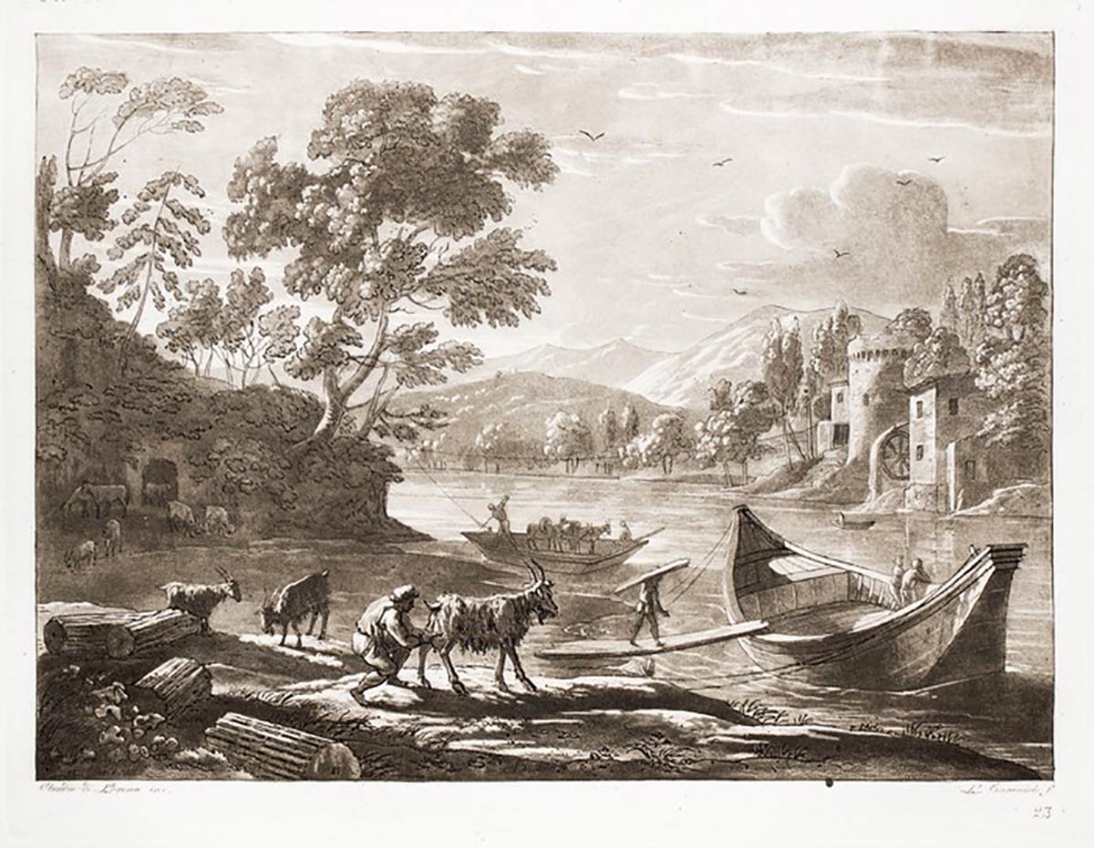Ludovico Caracciolo (Roma, 1761-1841) fu un paesaggista e incisore romano, specializzato in disegni architettonici e vedute della Città Eterna. Caracciolo amò viaggiare e disegnare le scene viste durante il viaggio. Divenne un protetto di Elizabeth Foster, la seconda moglie del quinto duca di Devonshire, William Cavendish. Grazie a lei ebbe l'opportunità di pubblicare una serie di stampe ispirate alle opere di Claude Lorrain, raccolte nel "Liber Veritatis", Roma, Francesco Bourlié, 1815 (un altro esemplare nella collezione del British Museum).