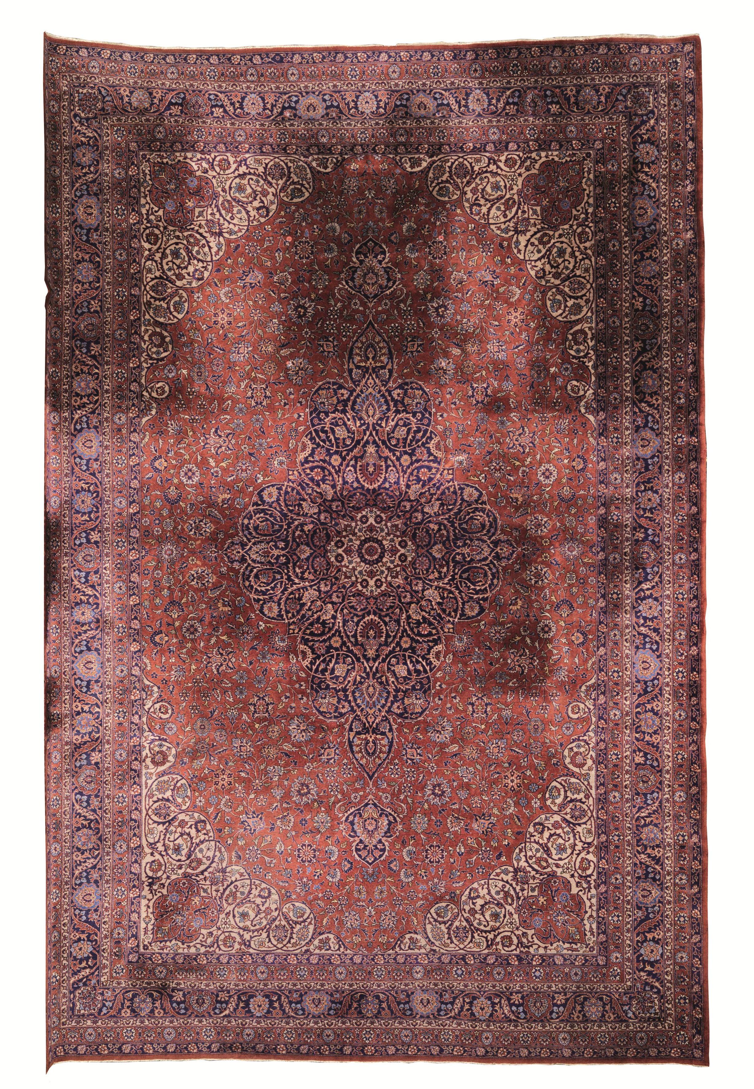 Grande tappeto Kirman, fondo rosso con decoro floreale nei torni del blu, al centro grande medaglione, molteplici bordure, cantonali avorio, cm 360x544, consunto