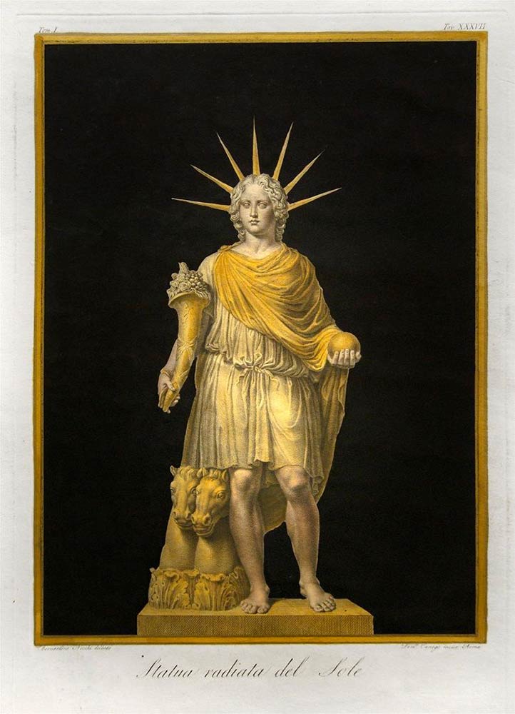 Rappresenta la statua raggiante della divinità del Sole. Da "Illustrazioni de'Monumenti scelti Borghesiani già esistenti nella Villa sul Pincio (..)date ora per la prima volta in luce dal cav. Gio. Gherardo De Rossi e da Stefano Piale sotto la guida di Vincenzo Feoli." di Ennio Quirino Visconti, pubblicato a Roma, 1821. Si tratta di due volumi di incisioni raffiguranti le principali statue antiche raccolte dal Principe Borghese nella sua Villa al Pincio. Contribuirono gli artisti notevoli come Luigi Cunego, Gio. Batta Leonetti, Pietro Bettelini, Gio. Hanno contribuito Brunetti, Giovanni Ottaviani, Angelo Campanella, Pietro Fontana. I disegni furono soprattutto di Agostino Tofanelli, Bernardino Nocchi, Domenico de Angelis, Teodoro Matteini.