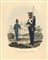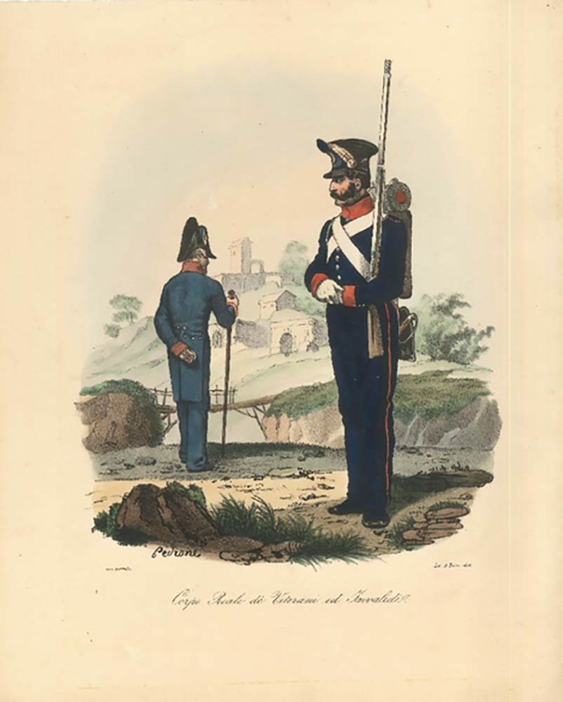 Titolo al centro del margine inferiore. Firmato su lastra "Petrone" sul margine inferiore sinistro. "Con permis", "Lit. D. Festa, 1836" in basso a destra. In ottime condizioni, salvo margini lievemente danneggiati. Interessante litografia a colori rappresentante due militari che indossano la divisa del Regio Esercito Italiano di Veterani e Disabili, all'inizio del XIX secolo.