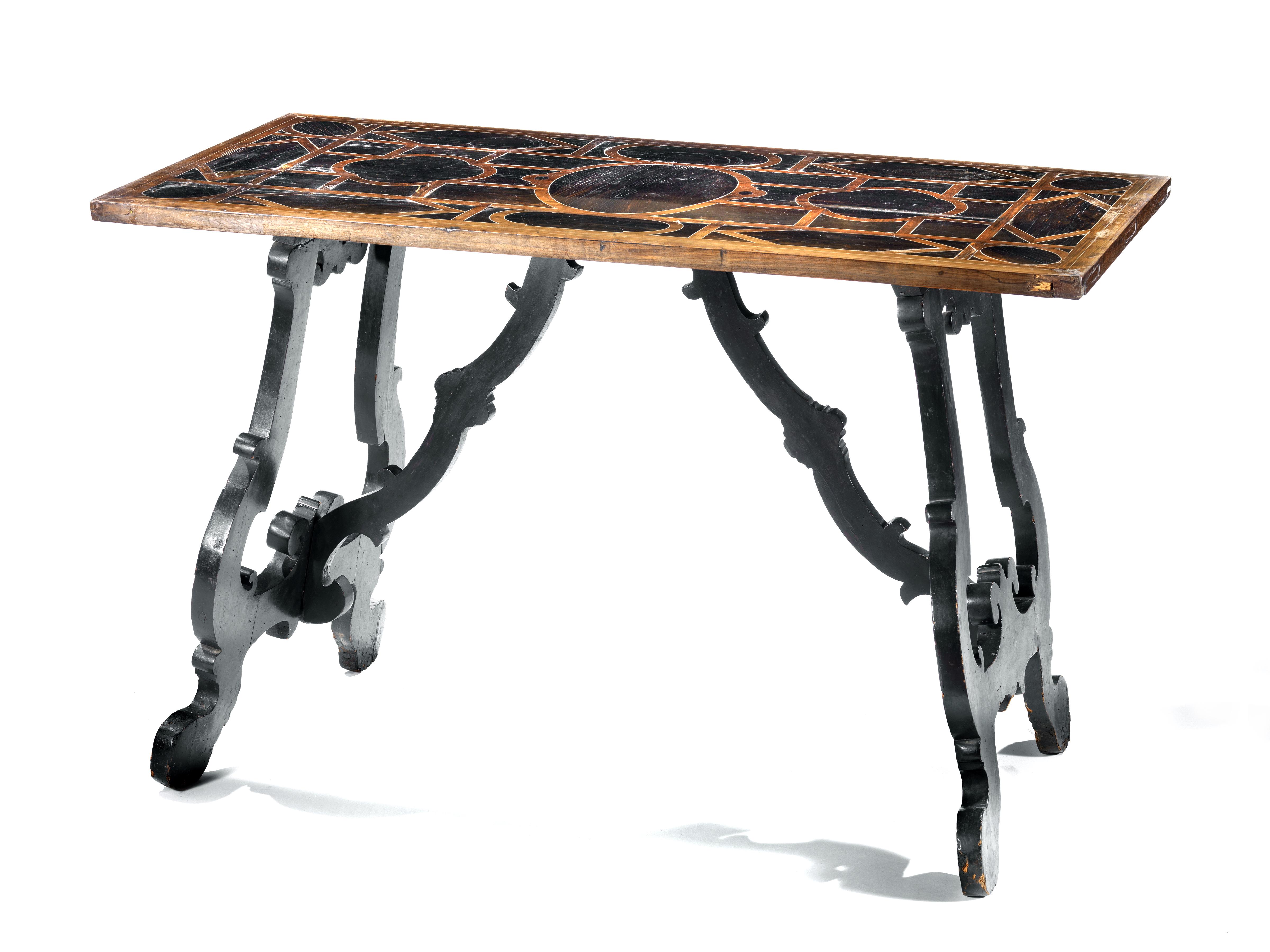 Importante tavolo, Toscana, metà sec. XVII, in ebano e palissandro, piano rettangolare intarsiato e filettato in avorio a motivi geometrici, gambe a lira di epoca posteriore in legno ebanizzato, riunite da sproni sagomati, cm 128x64x81, alcuni danni e sollevamenti della listratura