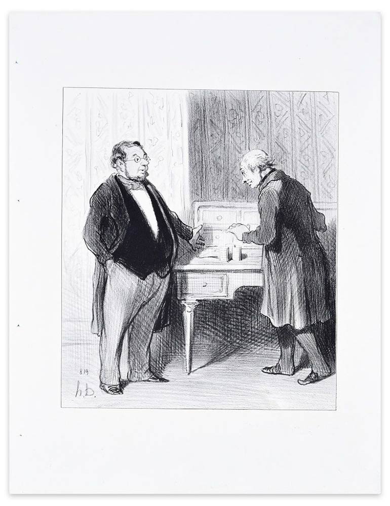 Iniziale dell'artista su lastra in basso a sinistra. Questa litografia è il numero 34 della serie "Les Philantropes du Jour", pubblicata da Le Chiarivari nel 1846.