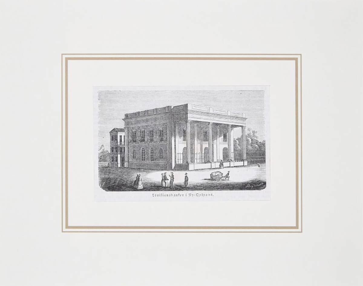 Bellissima xilografia in bianco e nero su carta, realizzata nel 1848 da Biyandt. Firmata su lastra al margine inferiore destro. Titolata su lastra, in tedesco, in caratteri gotici, al centro del margine inferiore. Buone condizioni. Passepartout di cartone color crema incluso. Questa stampa rappresenta un edificio coloniale nella città di New Orleans in Louisiana con un ottimo gioco di luci e ombre e un buon effetto finale dei toni. Fu un'illustrazione per un quotidiano tedesco "Nordiff Penning- Magazin".