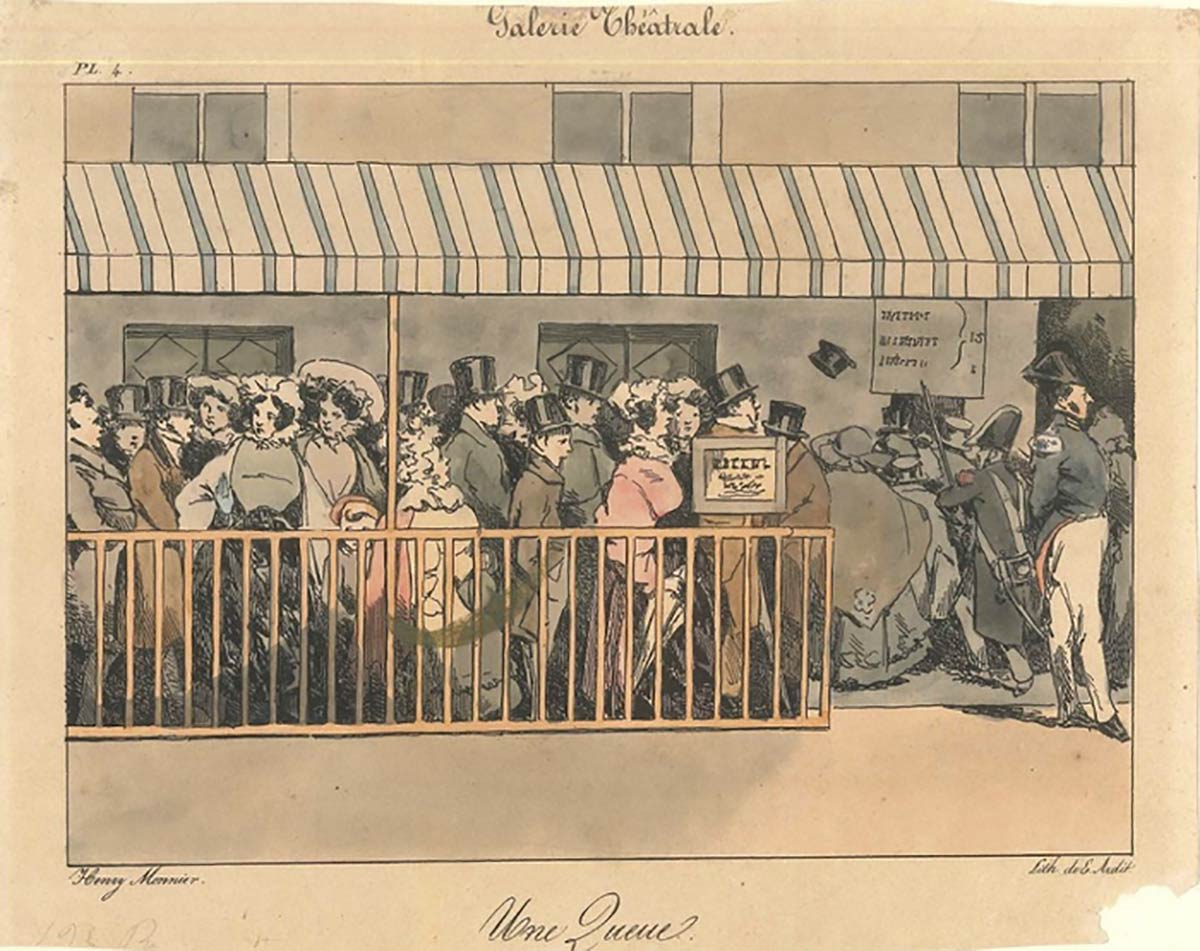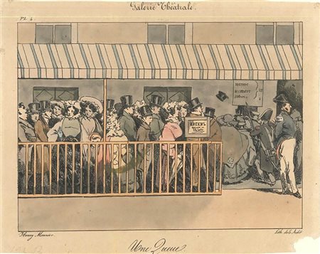 Una divertente litografia acquerellata realizzata da Henry Monnier (1805 - 1877). Questa stampa rappresenta le persone stando in fila per acquistare i biglietti del teatro. Buone condizioni salvo mancante angolo in basso a destra e qualche piccola macchia ai margini. Passepartout incluso.