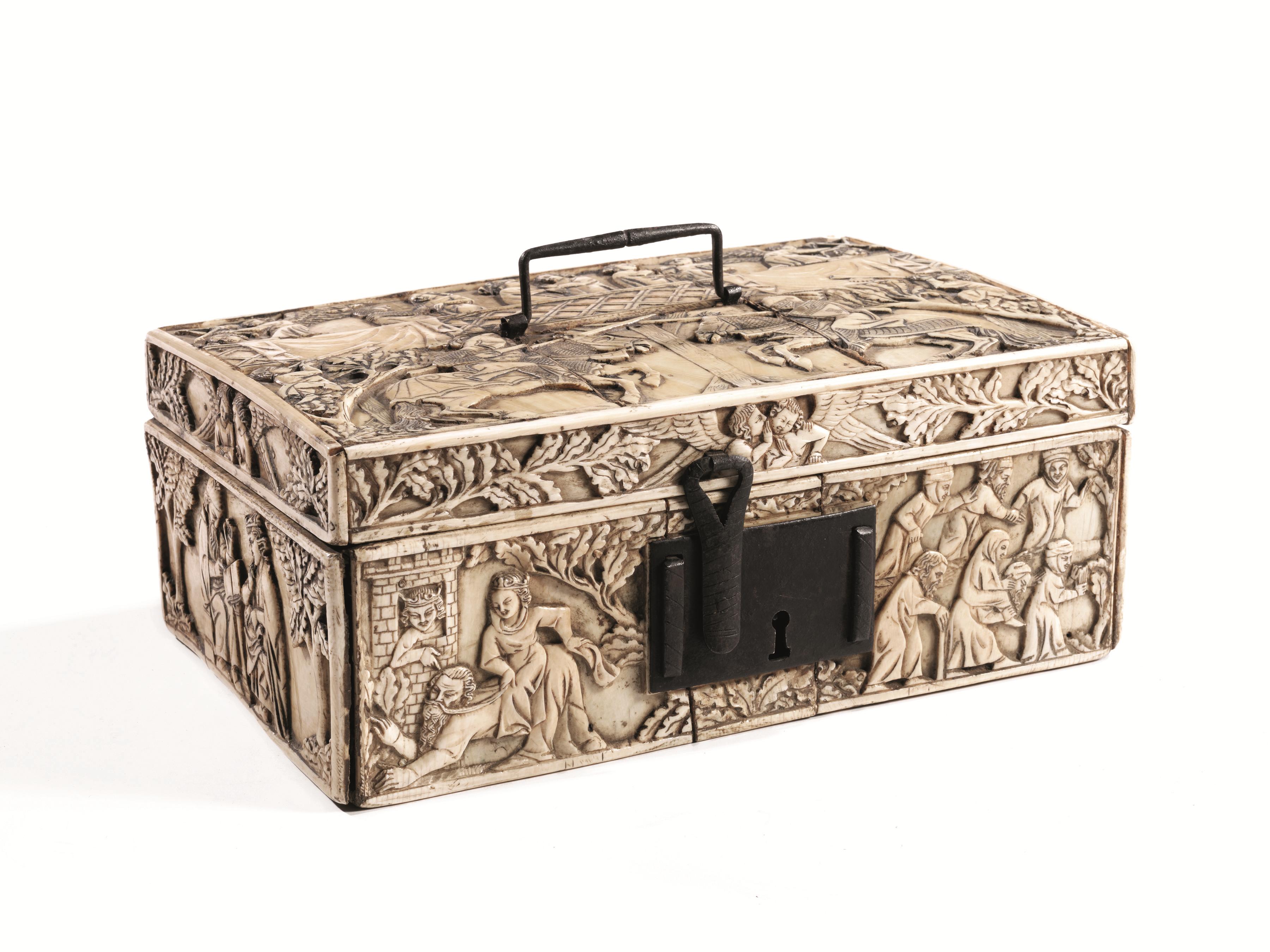 Cofanetto nel gusto degli Embriachi, in legno rivestito da placchette in avorio intagliate a scene cavalleresche, manico e serratura in ferro, interno in velluto ricamato,