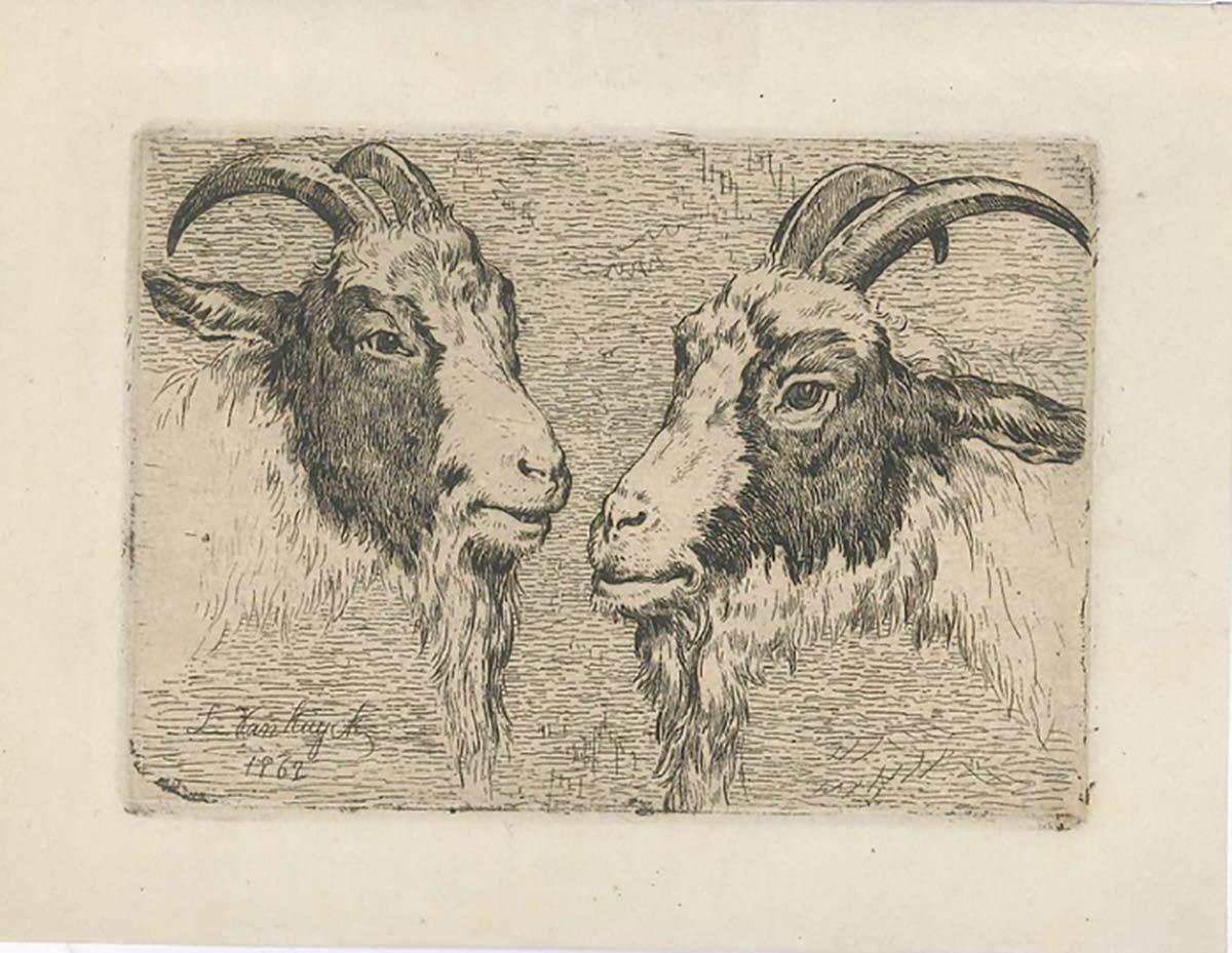 "Capre" è una meravigliosa acquaforte in bianco e nero realizzata nel 1862 dal pittore e incisore belga Louis van Kuyck (Hoboken, 1821 - Antwerpen, 1871). Questa stampa raffigurante due capre riproduce perfettamente la morbidezza della pelliccia. Firmata e datata su lastra in basso a sinistra.