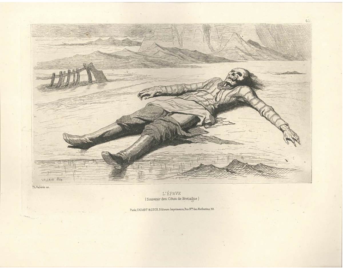 Opera d'arte originale realizzata da Théodore Valério nel 1869. Acquaforte originale su carta. Passepartout incluso. Intitolata su tavola al margine centrale (L'épave Souvenir des Côtes de Bretagne). Firmata e datata su lastra in basso a sinistra. Buone condizioni.