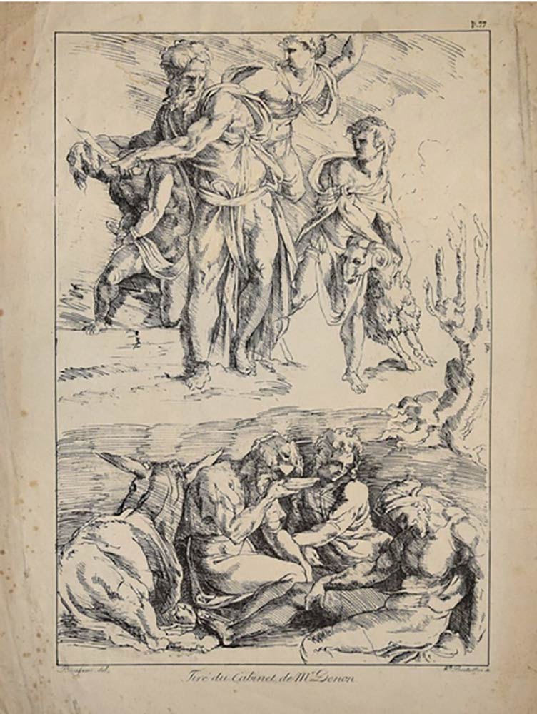 Realizzata dall'artista francese Louise Bouteiller nella prima metà del XIX secolo. "Tirér du Cabinet de Vivant Denon" inciso sul piatto in basso a destra. In buone condizioni, qualche fioritura ai margini. La litografia è stata realizzata da un'opera del pittore italiano Domenico Beccafumi (1486 - 1551). La composizione è divisa in due parti; la litografia è realizzata in bianco e nero.